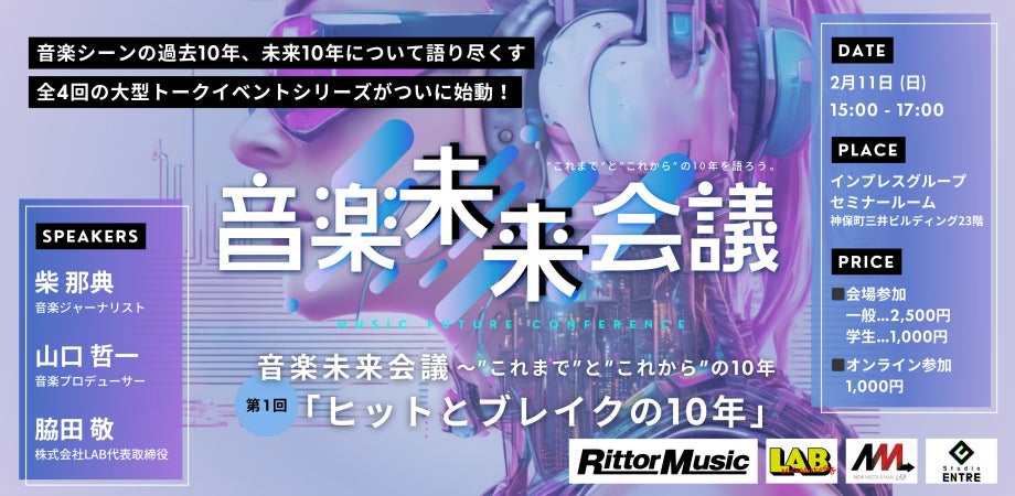 『ヒットの崩壊』『平成のヒット曲』などの著作で知られ、音楽分析、アーティスト取材とテクノロジー理解からヒットを読み解く音楽ジャーナリストの柴那典氏を迎え、株式会社Studio ENTRE代表の山口哲一(エンターテック・スタートアップ支援)、株式会社LAB代表脇田敬(音楽デジタルマーケティング)の3人が音楽シーンを4つのテーマに分けて過去10年を語り、未来10年を予想する。2月11日の第一回のイベントを実施、5月(第2回)、8月(第3回)、11月(第4回)にイベント実施し、2025年1月に書籍化を予定。