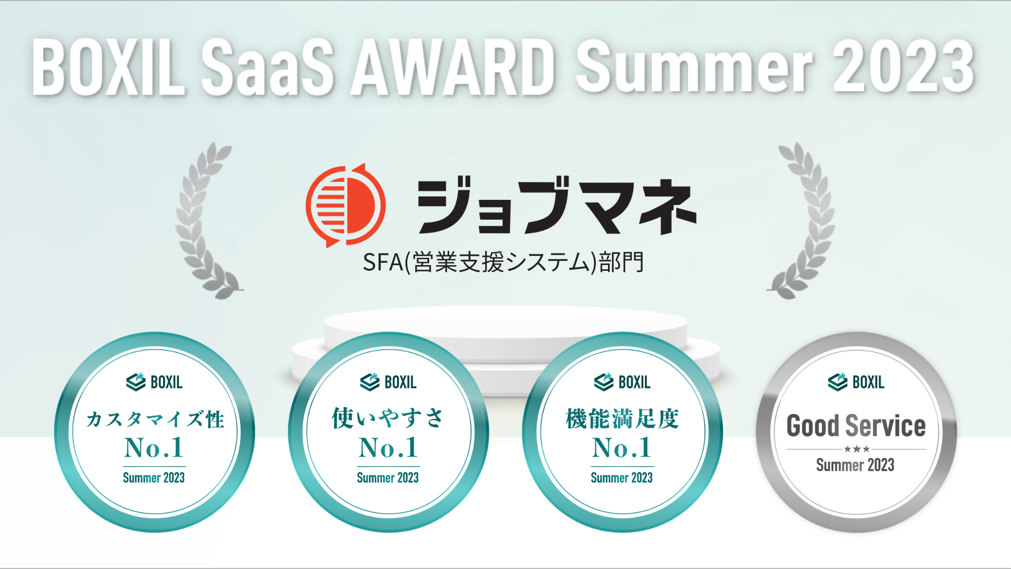格安業務管理ツールの「ジョブマネ」、「BOXIL SaaS AWARD Summer 2023」SFA部門で「Good Service」、「機能満足度No.1」、「使いやすさNo.1」他に選出
