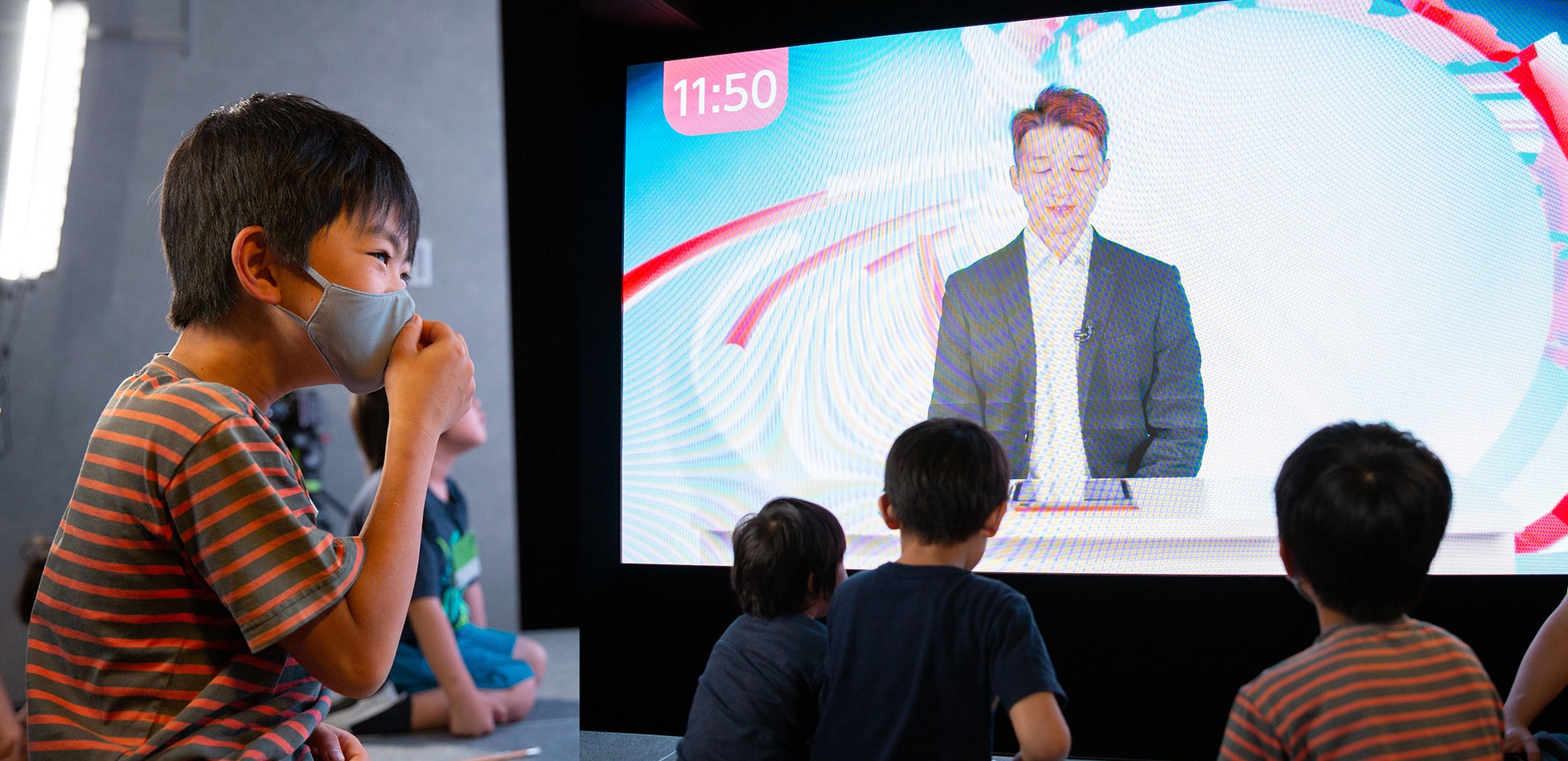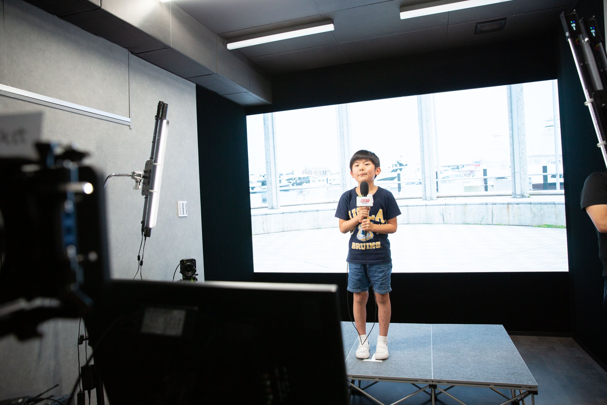映像制作体験では、ディレクター、カメラマン、録⾳、スイッチャーの撮影技術の他に、キャストとしてレポーターの体験ができる内容になっている。今回の体験では、マルチロケーションを可能にする今注⽬のLEDスタジオを使うことでさまざまな場所でのレポートの撮影を可能にしている。