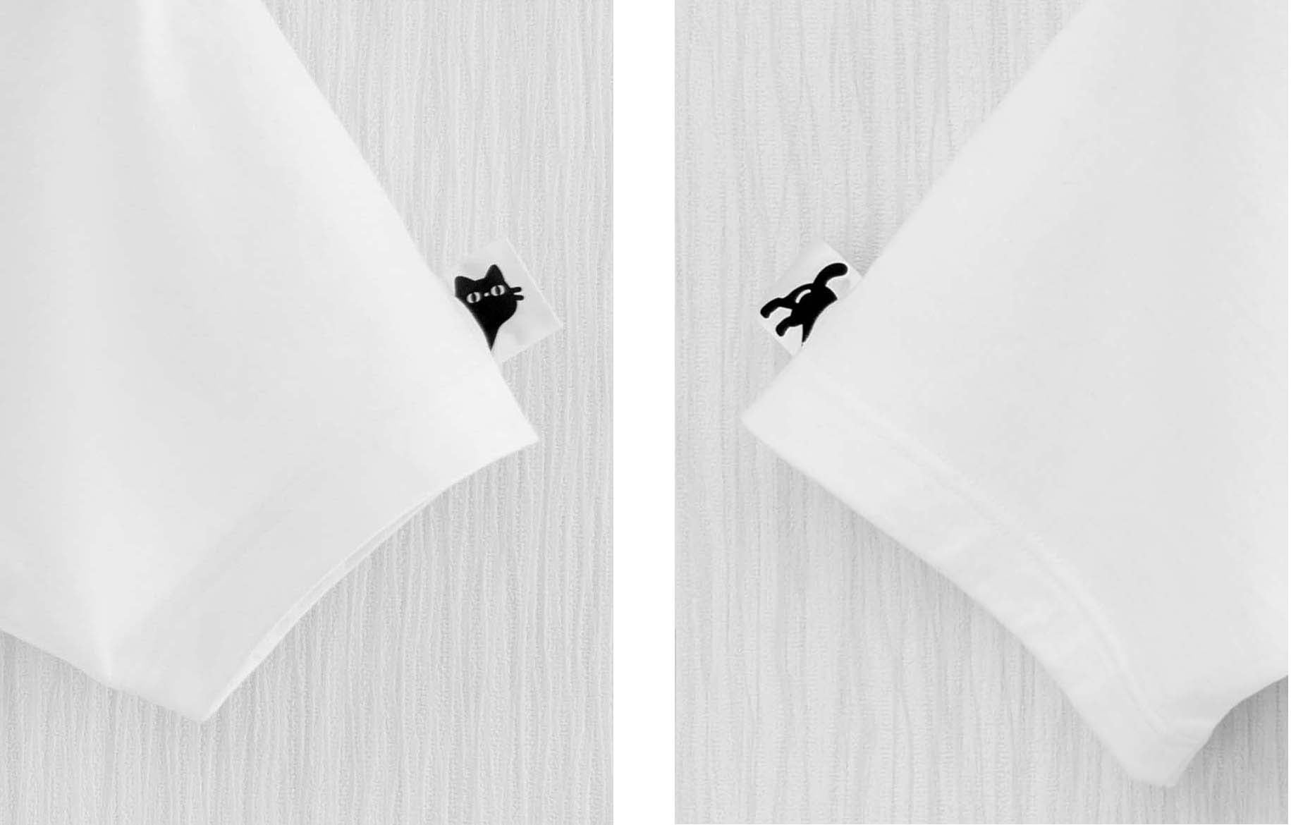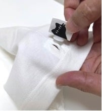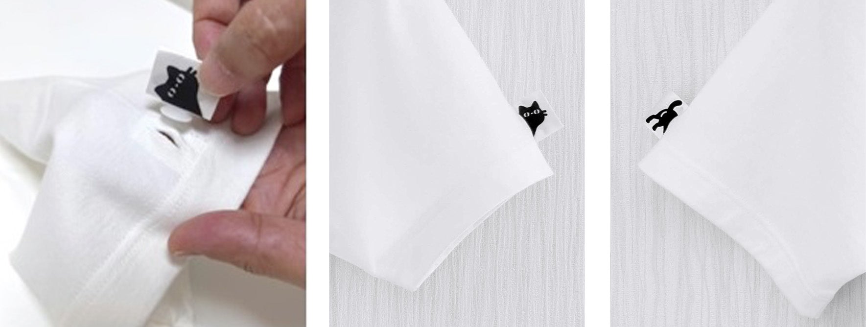 ↑タグの脱着 ↑タグ表(袖から顔出しネコ) ↑タグ裏(袖に入るネコ)