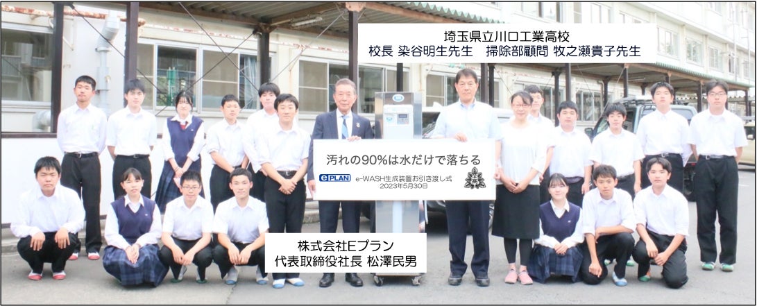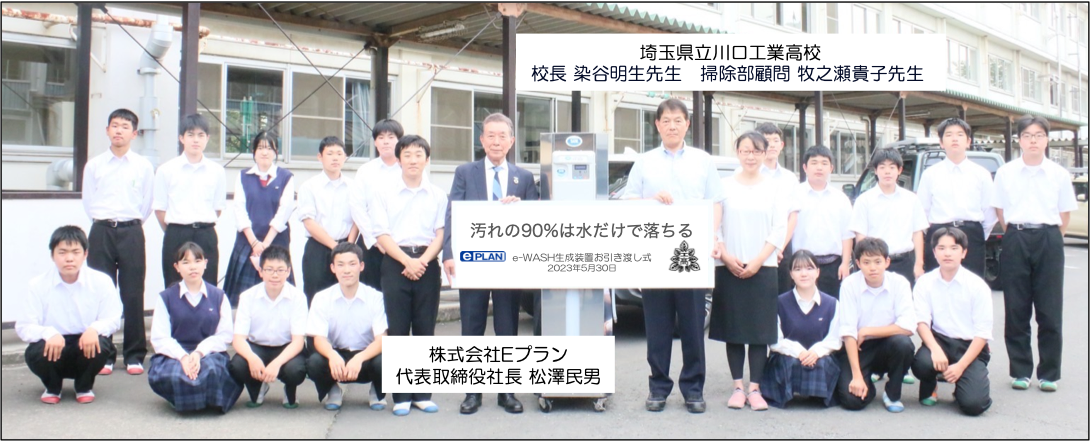 e-WASHは、当社独自の電解技術により作られる99.83%が純水でありながら、極限まで高めた水素イオン濃度指数の効果により、合成界面活性剤や有害な化学物質に頼らずに、様々な汚れやウイルス・細菌を落とし、除菌ができる高機能でサステナブルな洗浄水です。同校では、このe-WASHを掃除部の清掃活動に活用するとともに、機器メンテナンスや電気分解装置の構造理解などを通じて、工業高校としての実技学習にも活用して参ります。
