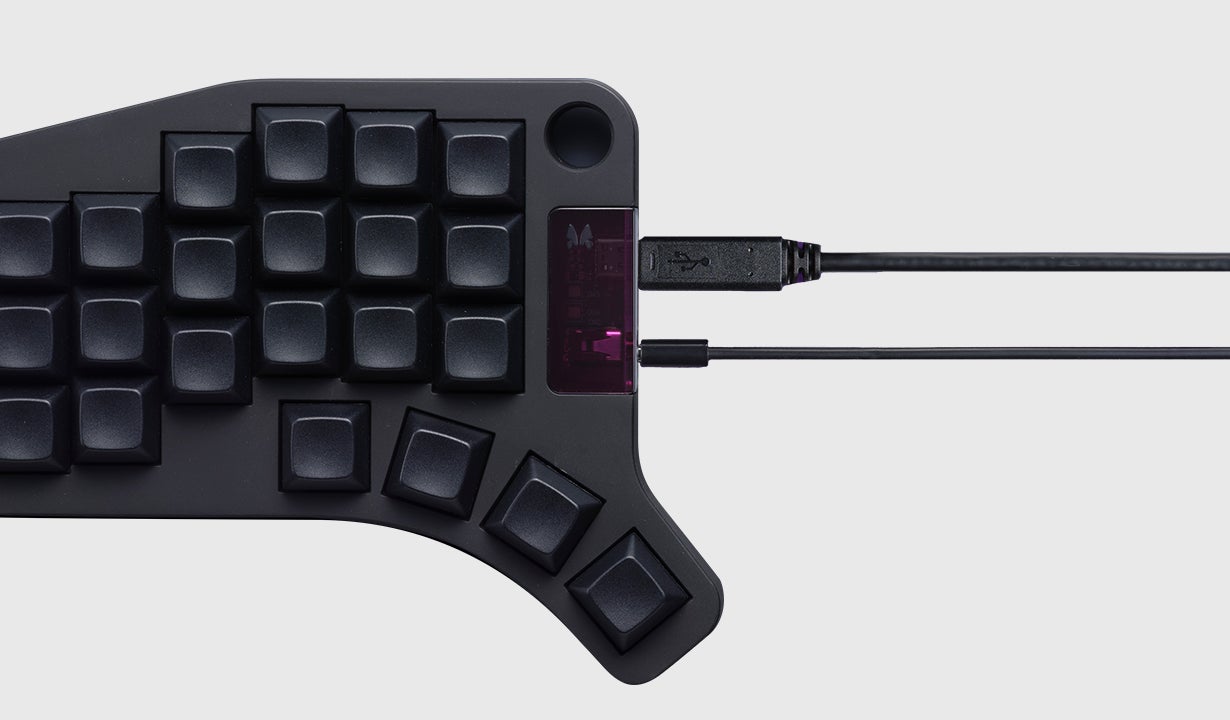 MOTHWINGはラグが1秒でも生じないようにあえて有線接続を採用しており、とことん生産性にこだわっています。PCとの接続はUSB Type-Cケーブル、左右のキーボードの接続はTRRSケーブルで接続されます。