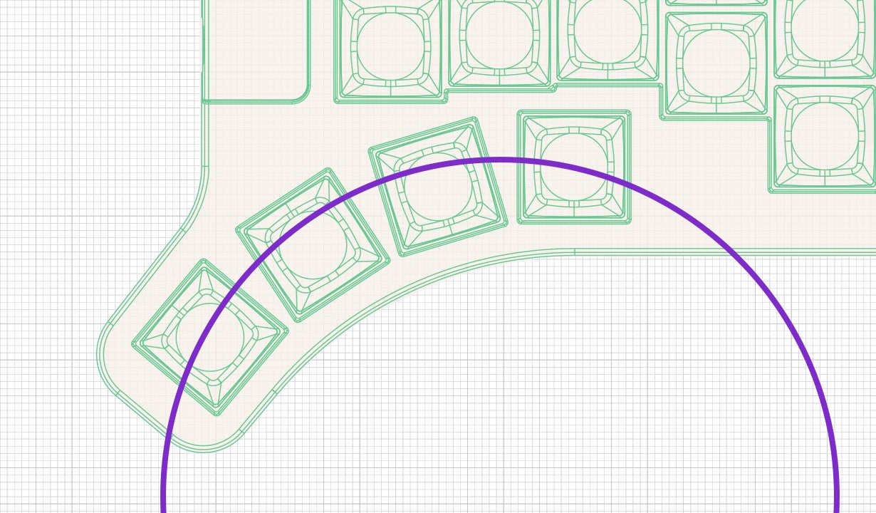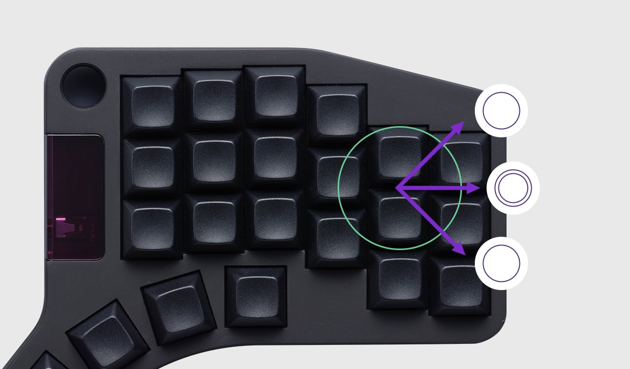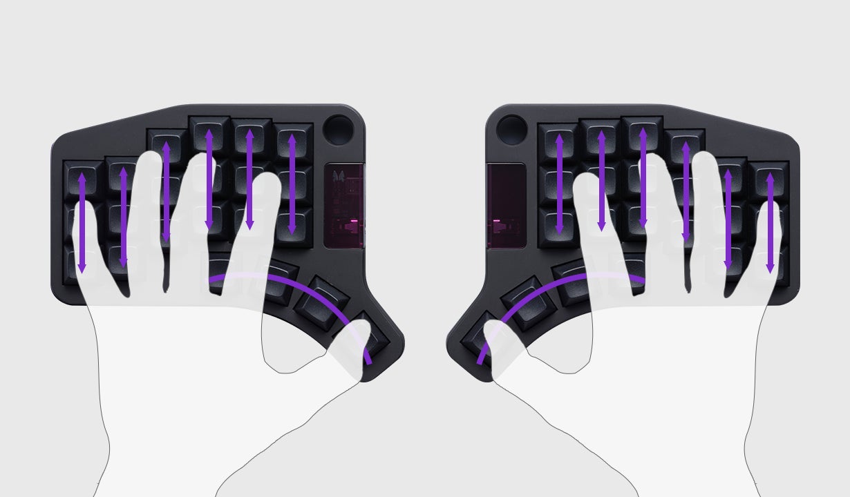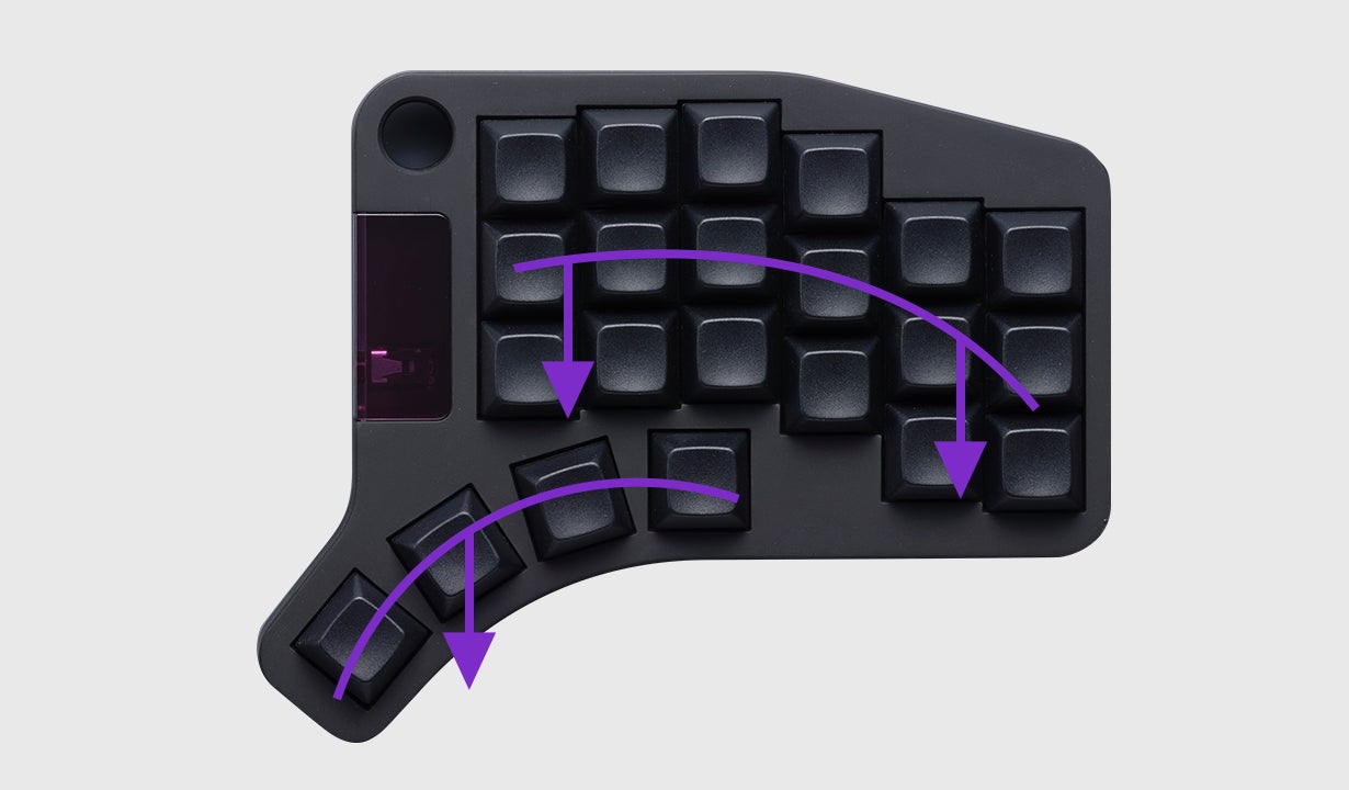 さらに、親指側のキーは手の形に合わせて手前側に弧を描くように配置をし、ホームポジションを崩さず滑らかにキータッチができるような構造にしています。
