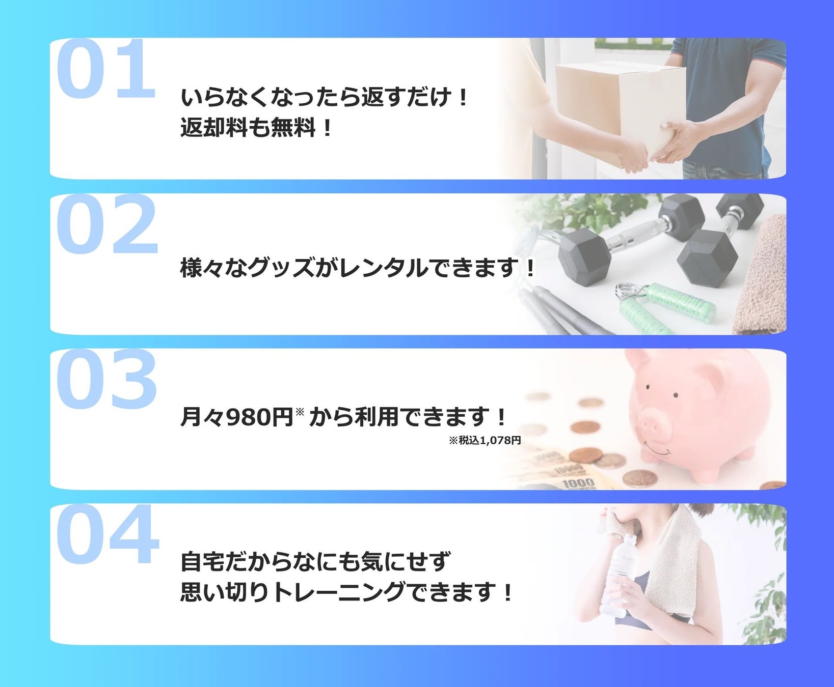 本サービスは、様々なトレーニング器具・フィットネス用品を低価格でご自宅にお届けします。「購入」ではなく「レンタル」なので、いらなくなったら返すだけ。トレーニング初心者や、トレーニングの継続に自信のない方でも安心してご利用いただけます。