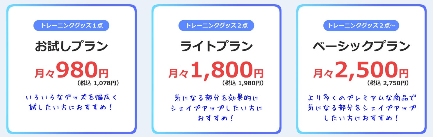 ベーシックプラン | 月額2,500円 (税込2,750円) | トレーニング器具を2点以上レンタルできるプラン。 プレミアムな商品で、より効果的にシェイプアップしたい方におすすめ。 |