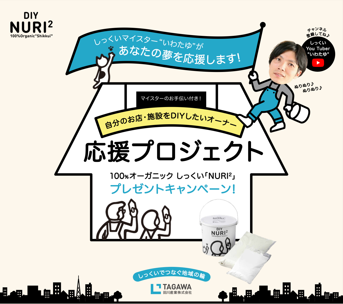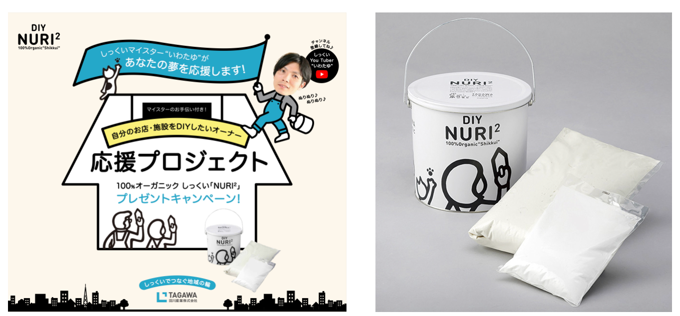 特典 (1)100%オーガニックしっくい「NURI2」を無償提供 (2)しっくいマイスターが現場へ出張手伝い (3)当社公式Instagramにて店舗紹介