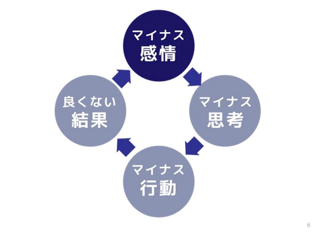 様々な感情に振り回されてしまう事で、自己批判や絶望感、憤りといった感情が⽣まれてきます。その感情は思考に影響を与えます。マイナスな思考から生まれる行動はほとんどの場合、効果的ではない行動が増えの望まない結果を生み出してしまう事が多くあります。