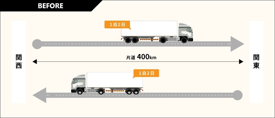 現在、ひとりのドライバーが東京・大阪間を1台のトラックを1人で走行し続けることがほとんどですが、荷物の積み下ろしなどの荷役作業に加え、帰り荷が出てくるまで2~3日外泊をして荷待ちをしなければならないなど、ドライバーの体力への負担が大きく、効率が悪い上に決して労働環境が良いとは言えない状況です。