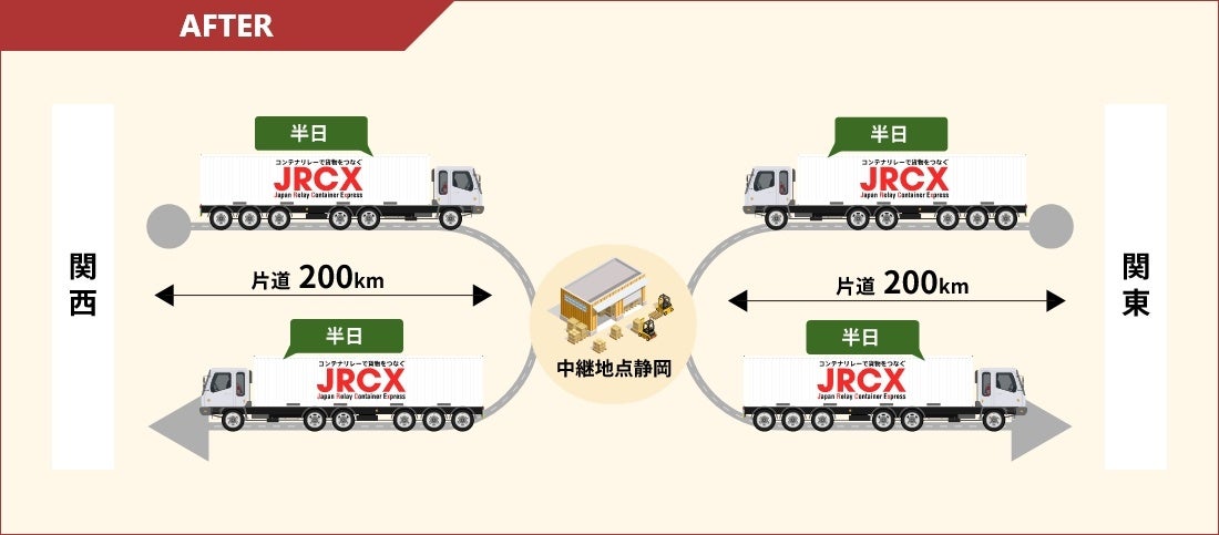 セミトレーラー中継幹線輸送サービスは、例えば、東京・大阪間走行の場合、ドライバー1人あたりの運行距離を1日片道約200km・往復約400kmに、そして約8時間の労働時間を遵守することを可能にします。これは、1人で走っていた時のほぼ半分に改善されることになります。