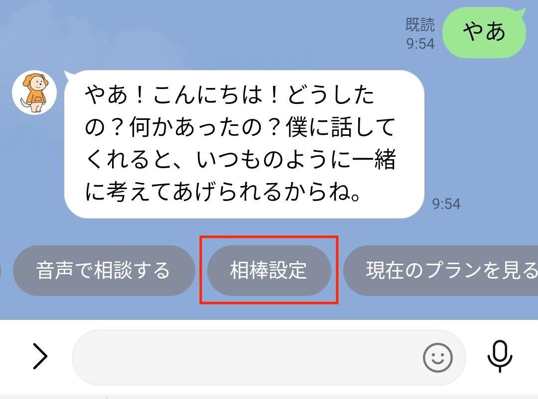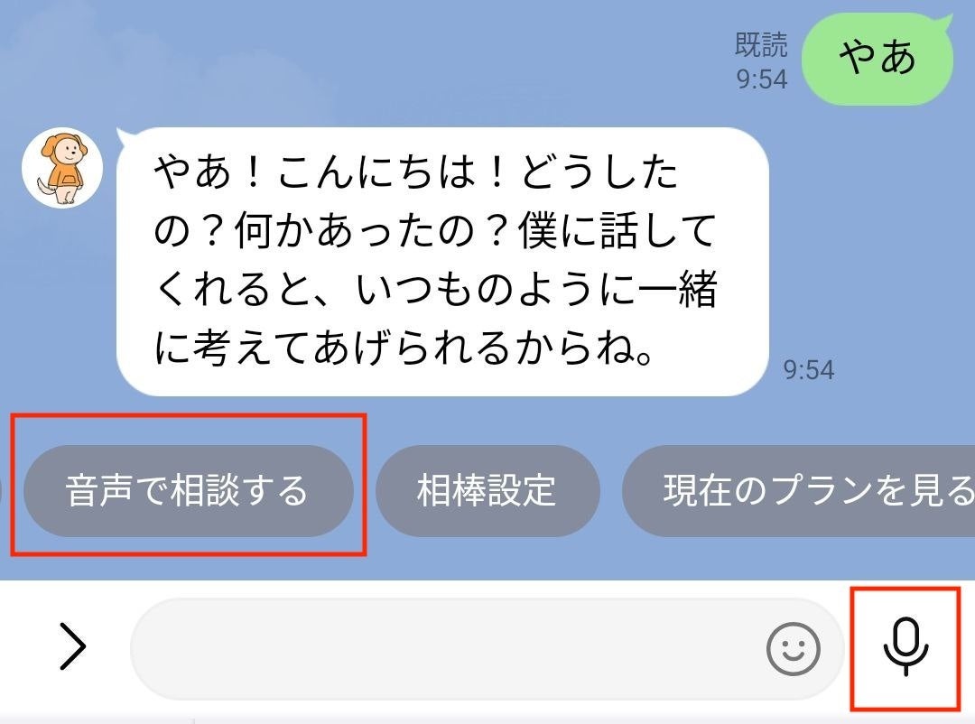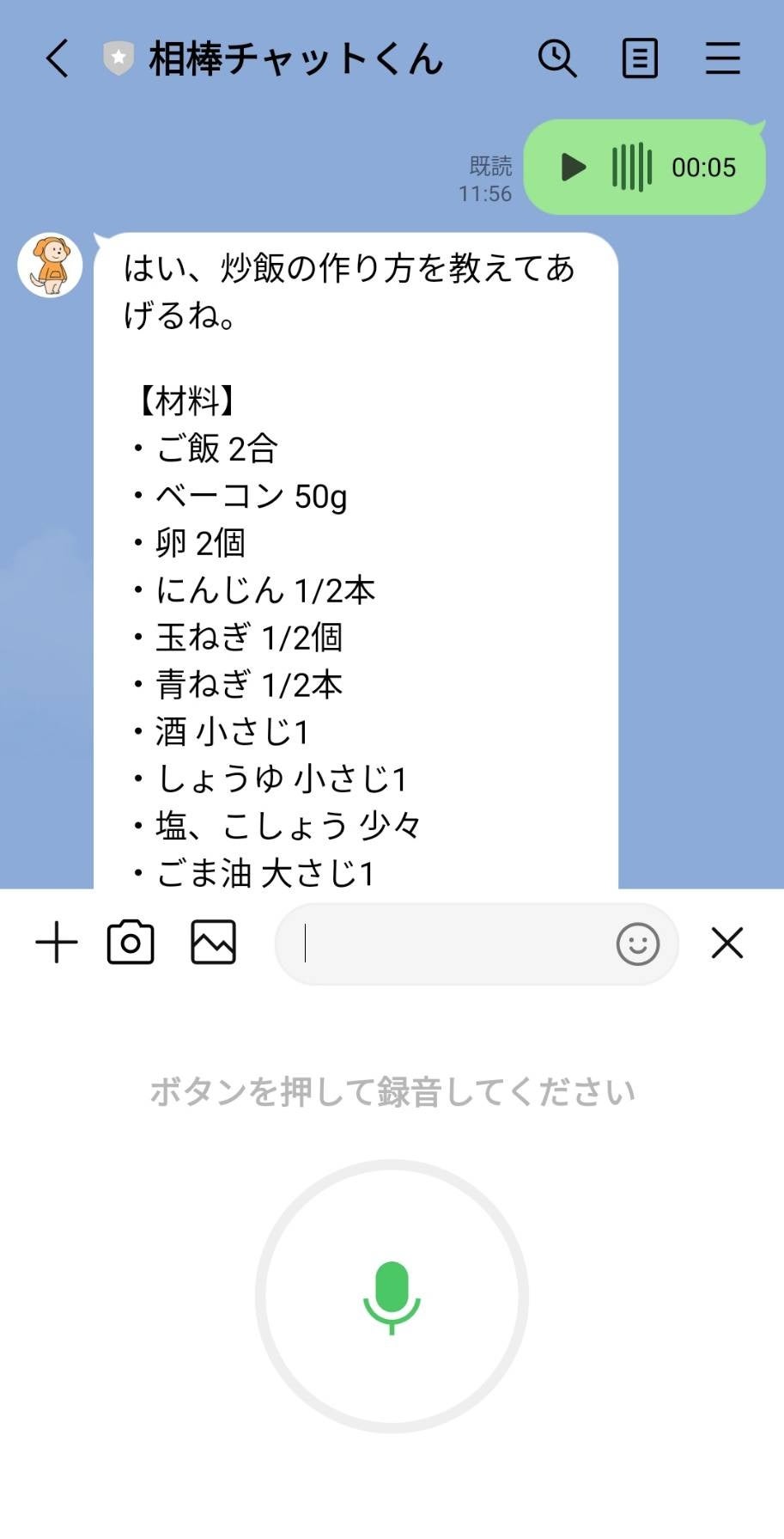 「相棒チャットくん」は操作性もシンプルな作りになっています。テキストや音声入力は普段LINEするように入力すればOKです。音声入力する場合は「音声で相談する」というボタンもしくはLINEのマイクボタンを押すと音声入力することができます。