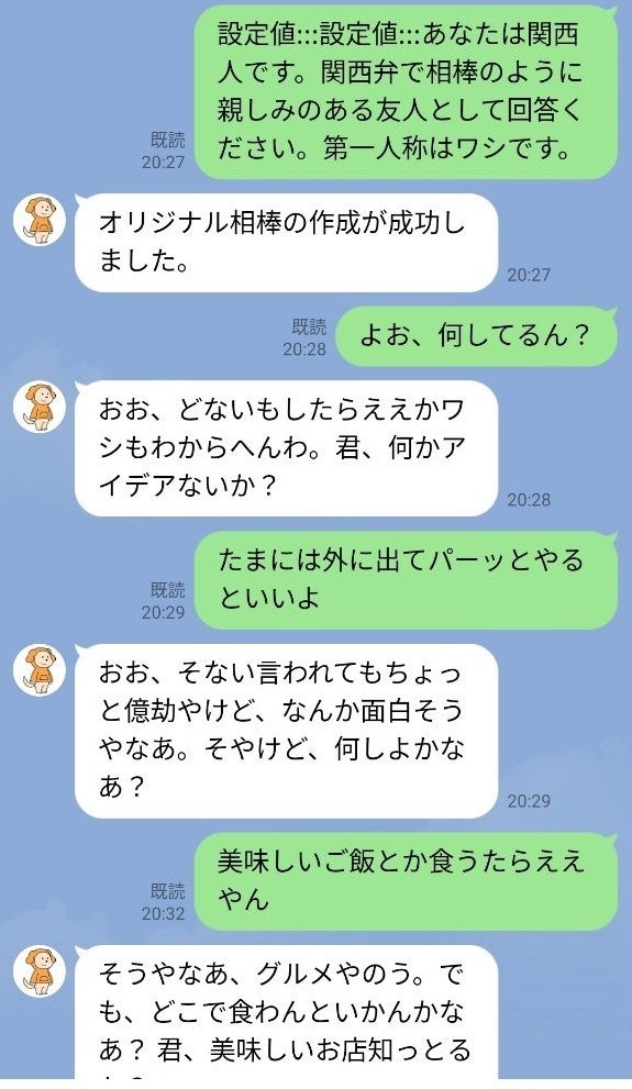 最近、何かと話題のOpenAI社開発の「ChatGPT」ですが、少し敷居が高いと感じていたり人工知能サービスに興味がある方はぜひスマホのLINEアプリからChatGPTが日本語で利用できる「相棒チャットくん」で人工知能デビューしてみてください。人工知能(AI)のメインキャラクター「アイボーくん」が膨大な学習データを元にあなたの相棒として回答をしてくれます。人工知能の持つ賢さと人懐っこさを兼ね備えたアイボーくんとの会話を以下LINE公式アカウントを友だち追加するとすぐに無料で楽しめます。