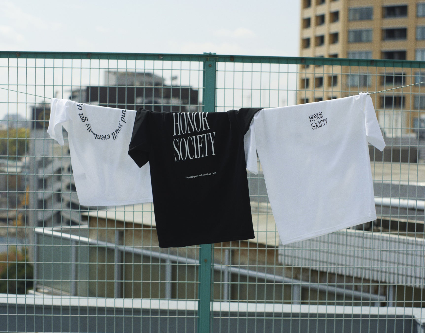 Honor SocietyからはベーシックなロゴTシャツをはじめ、東京のクリエイターによってデザインされたグラフィックが施されたウェアも発売します。