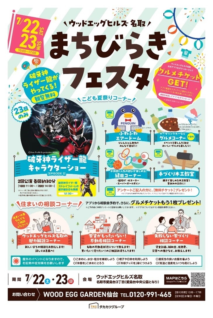 ウッドエッグヒルズ名取や家づくりの疑問など住まいに関する相談コーナーはもちろんのこと、グルメコーナーや、こども夏祭りと題して縁日コーナーや木工教室などの夏休みならではの企画もございます。23日(土)には、破牙神ライザー龍のキャラクターショーも開催予定。