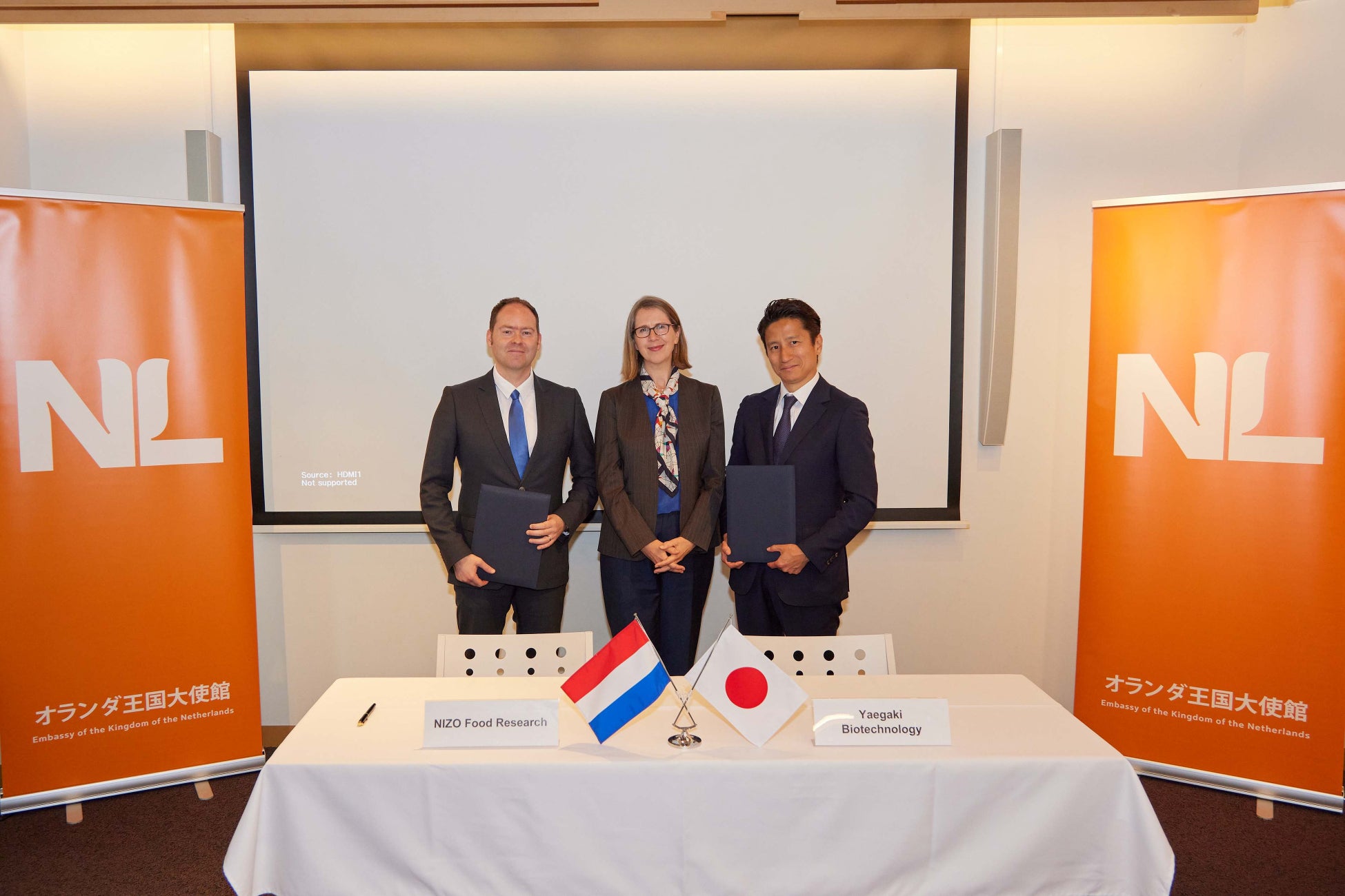 2023年5月9日、オランダ大使館(東京)においてオランダのNIZO Food Research社(NIZO社)とヤヱガキ醗酵技研株式会社(兵庫県姫路市:代表取締役社長 長谷川雄介)のコラボレーション合意書の調印を行いました。これは日本の伝統的な麹菌を始めとしたキノコ菌糸体と呼ばれる食品原料をベースとした代替肉の研究開発を行うためです。