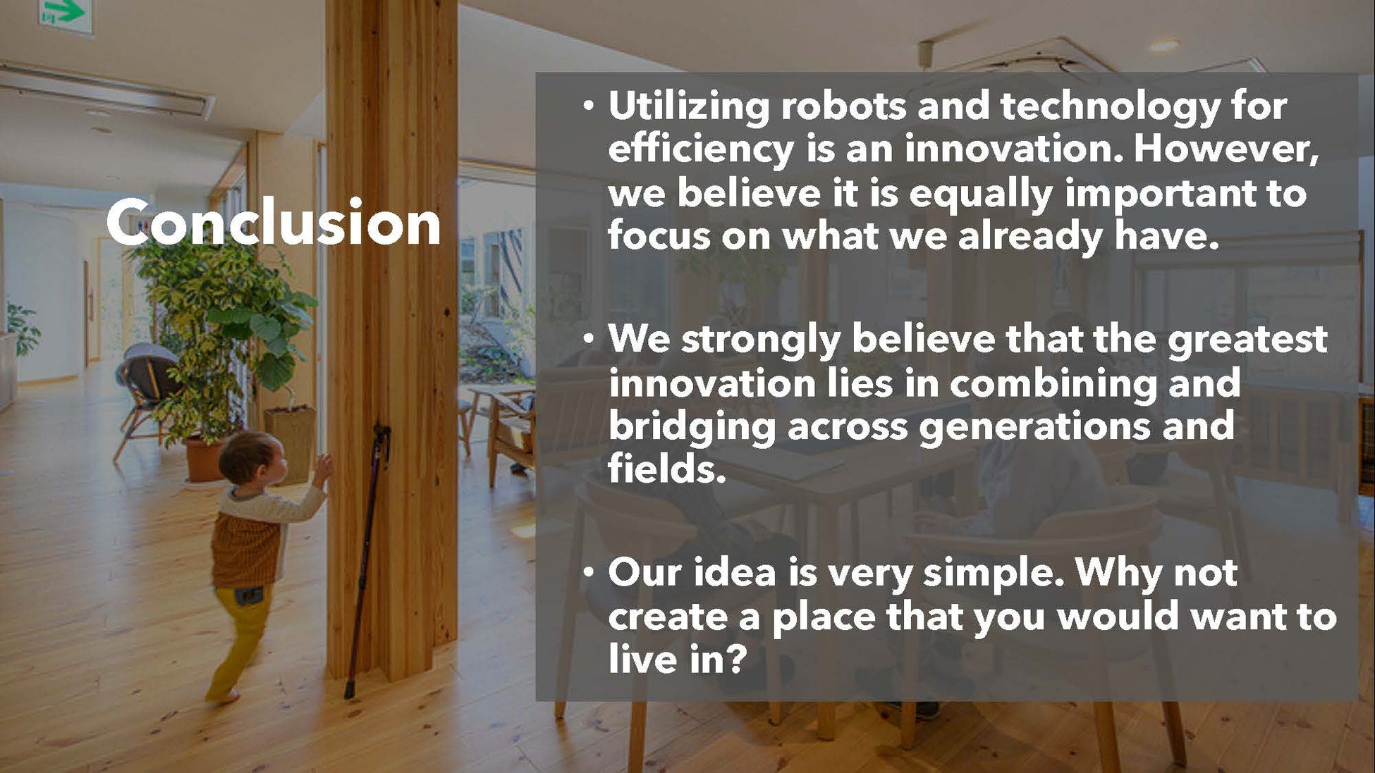最後に、最新のチャレンジとして高齢者×学生とのシェアハウスの事例について紹介し、自分たちの取り組みは最新のテクノロジーを利用したものではなく、「自分が入りたい施設づくり」を追い求めた結果であるということをアピールしました。