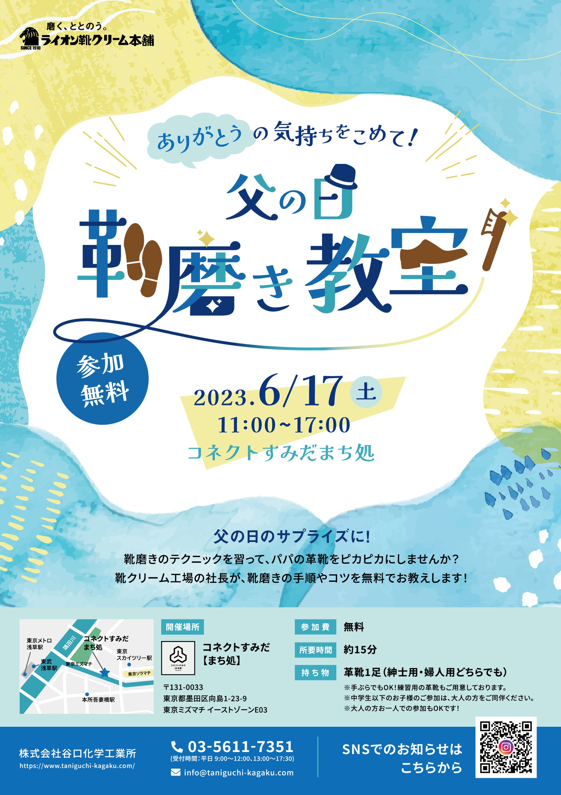 株式会社谷口化学工業所は、父の日を迎えるにあたり、感謝の気持ちを表す特別なイベントとして、「父の日:靴磨き教室」を開催することをお知らせいたします。この教室は、父親への感謝と敬意を込めて、親子で楽しめる靴磨き体験を通じて、心温まるひとときを提供することを目的としています。