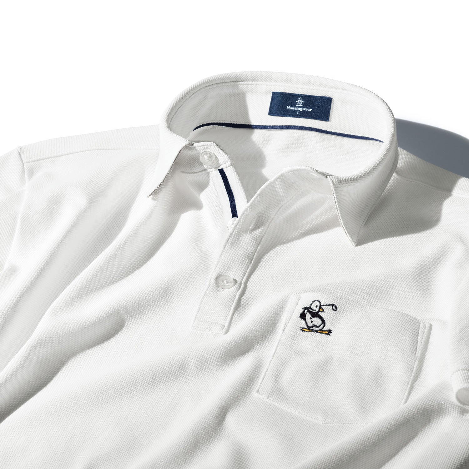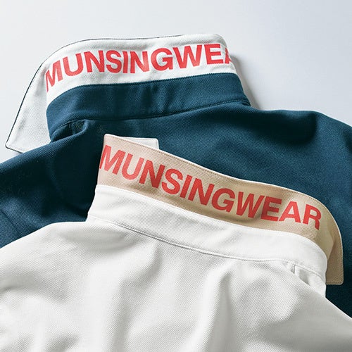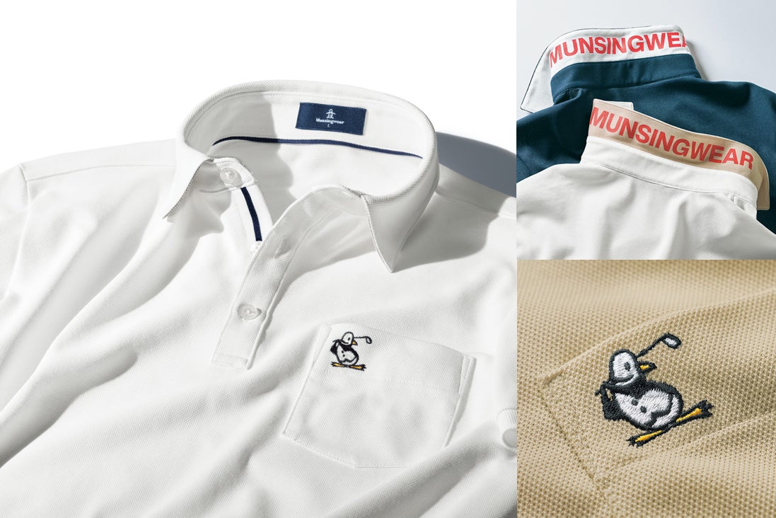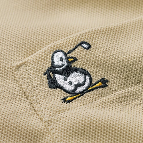 ジャケットを着用した際にも襟がきれいに決まってきちんとした印象に見えるこだわりの台襟付き。襟裏には別注で、ブランドロゴをプリントしました。胸ポケットには〈マンシングウェア〉のマスコットキャラクター、リトル・ピートを刺しゅう。ゴルフを楽しむ姿は当社別注です。