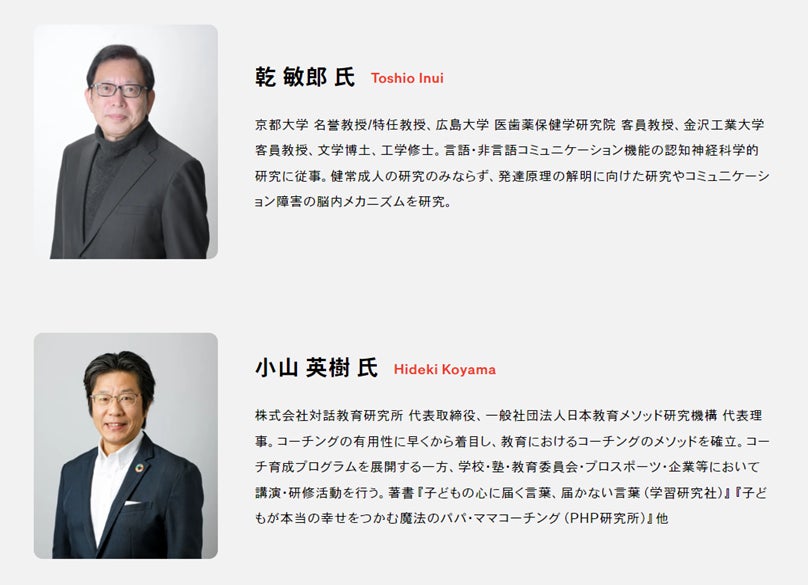 脳科学、発達神経科学、心理学分野における第一人者である京都大学名誉教授の乾敏郎氏には、発達段階や障害特性に関して脳のメカニズムの観点から監修いただき、さらに、教育コミュニケーション(コーチング、アクティブラーニング)のメソッドを確立し能力開発プログラムを展開してこられた小山英樹氏に、実践的な観点からの監修を頂くことで、学術的に有効な教育・療育コミュニケーションメソッドを完成させました。