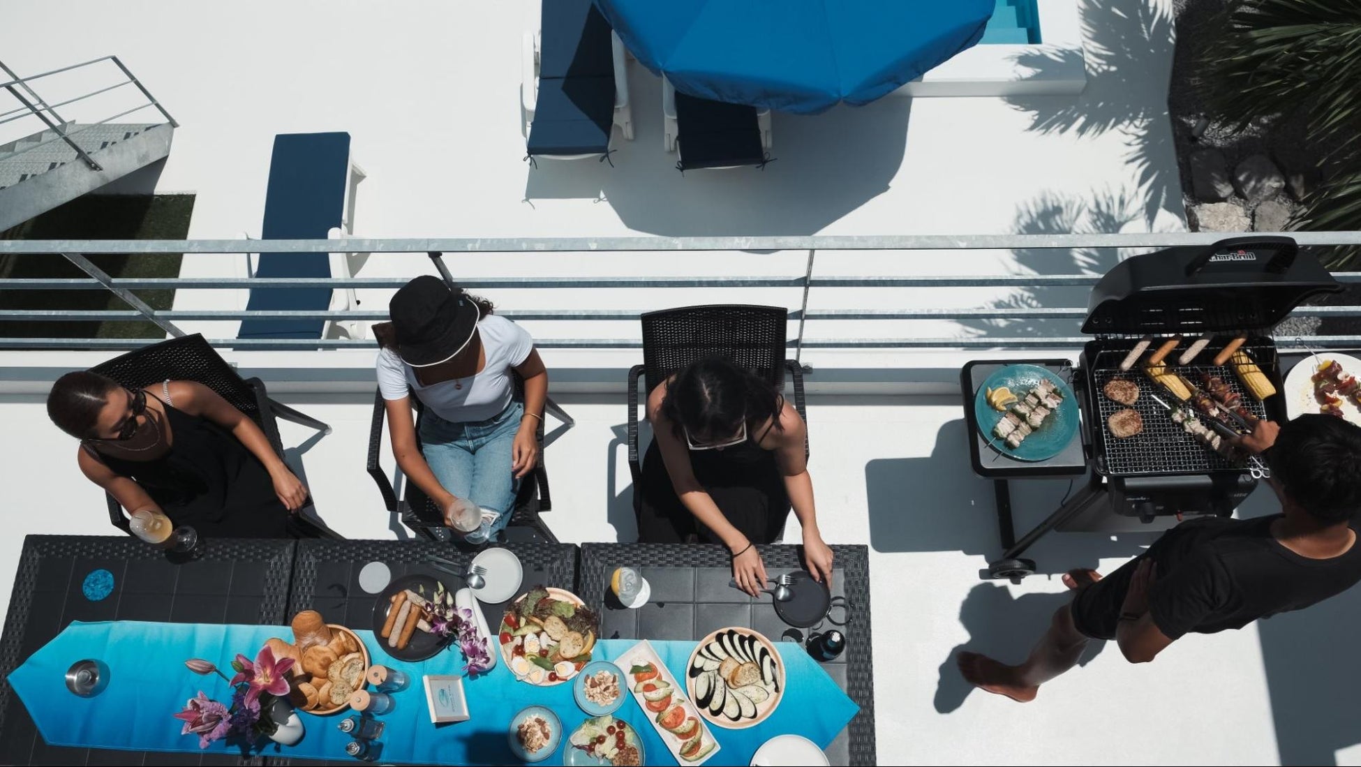 2階のダイニングテラスでは、BBQができます。石垣島の絶景を堪能しながら、食べるお肉は格別なこと間違いなし。快適に過ごせるようにパラソルやサンチェアがあることはもちろん、テーブルや食器、BBQセットなども完備しているので、BBQを満喫してください。