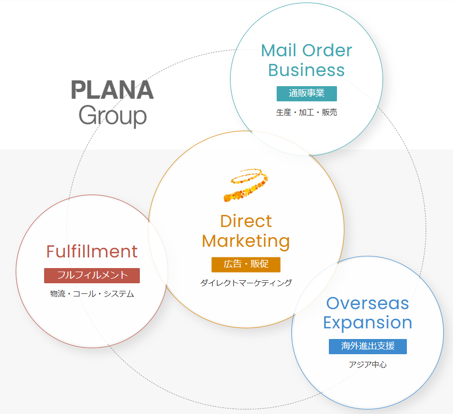 PLANAグループ:株式会社プラナコーポレーション、株式会社プラナコーポレーション東京、株式会社プラナコーポレーション大阪、株式会社プラナクリエイティブ、株式会社PWAN、大幸食品株式会社、株式会社北海道産地直送センター、株式会社産直、長島商事株式会社、株式会社九州産地直送センター、華日国際マーケティング有限公司(台湾)
