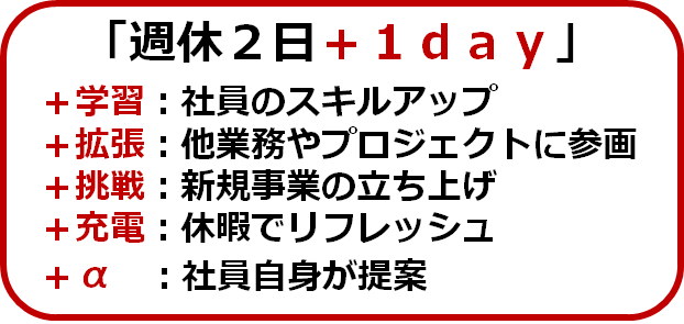 「+1day」の活用方法は、+学習、+拡張、+挑戦、+充電、+αの5項目で、+学習では学習系のテーマにトライする場合、上長の承認のもと年間20万円(税別)までの費用を会社がサポートします。「週休3日」ではなく、あえて「+1day」という概念を用いて、社員が “新たに生まれた自由に使える1日”をポジティブに捉え、自発的に業務の効率化を進めることを狙いとしています。