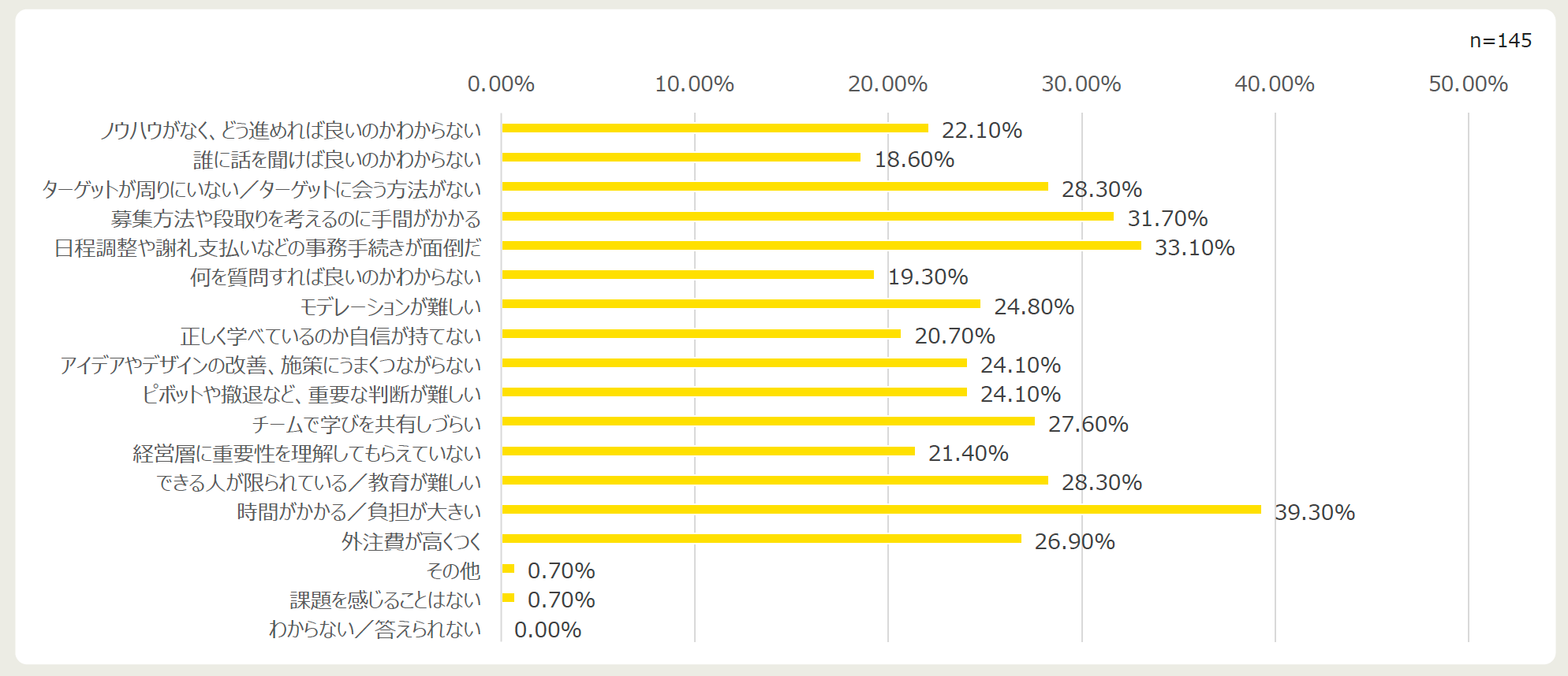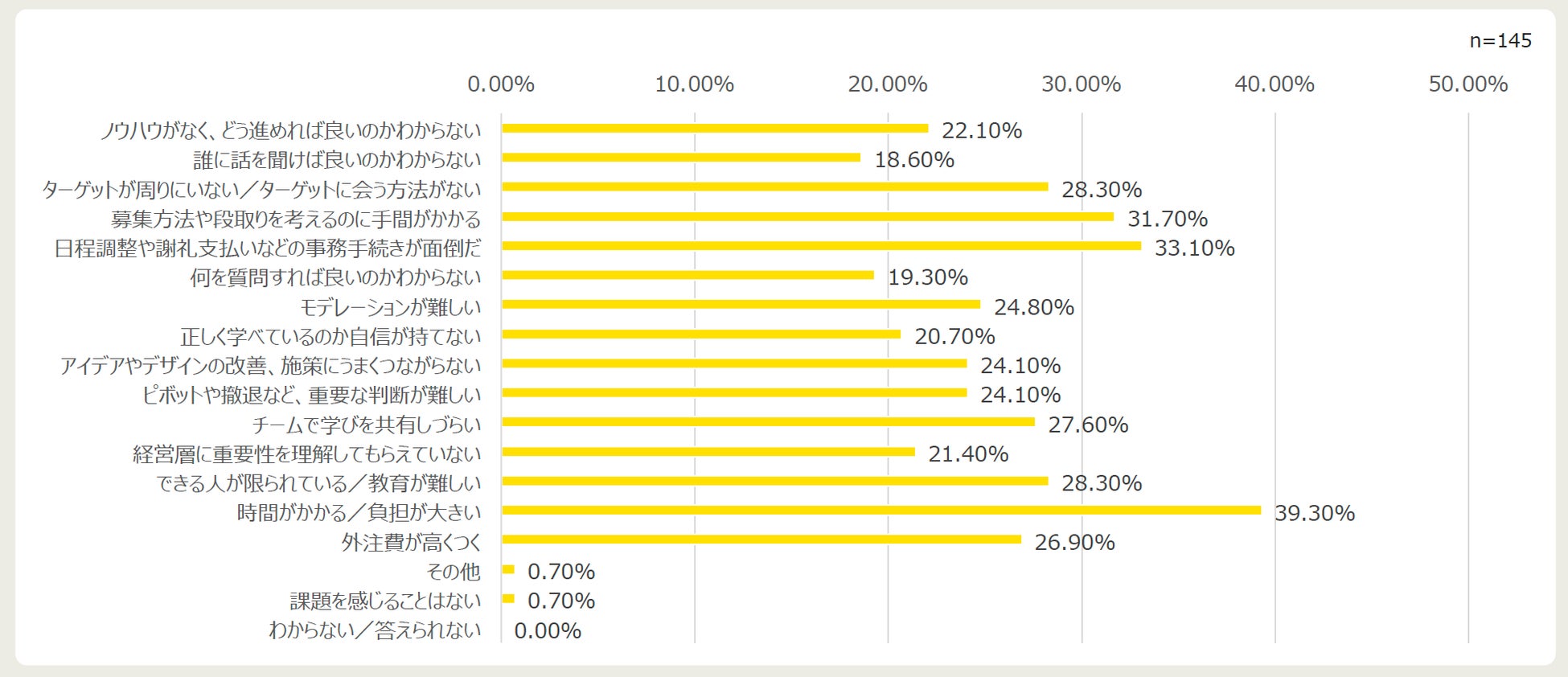 インタビュー調査で感じる課題としては、『時間がかかる/負担が大きい』『日程調整や謝礼支払いなどの事務手続きが面倒』『募集方法や段取りを考えるのに手間がかかる』など、時間的な手間に関する課題が上位3件に入りました。