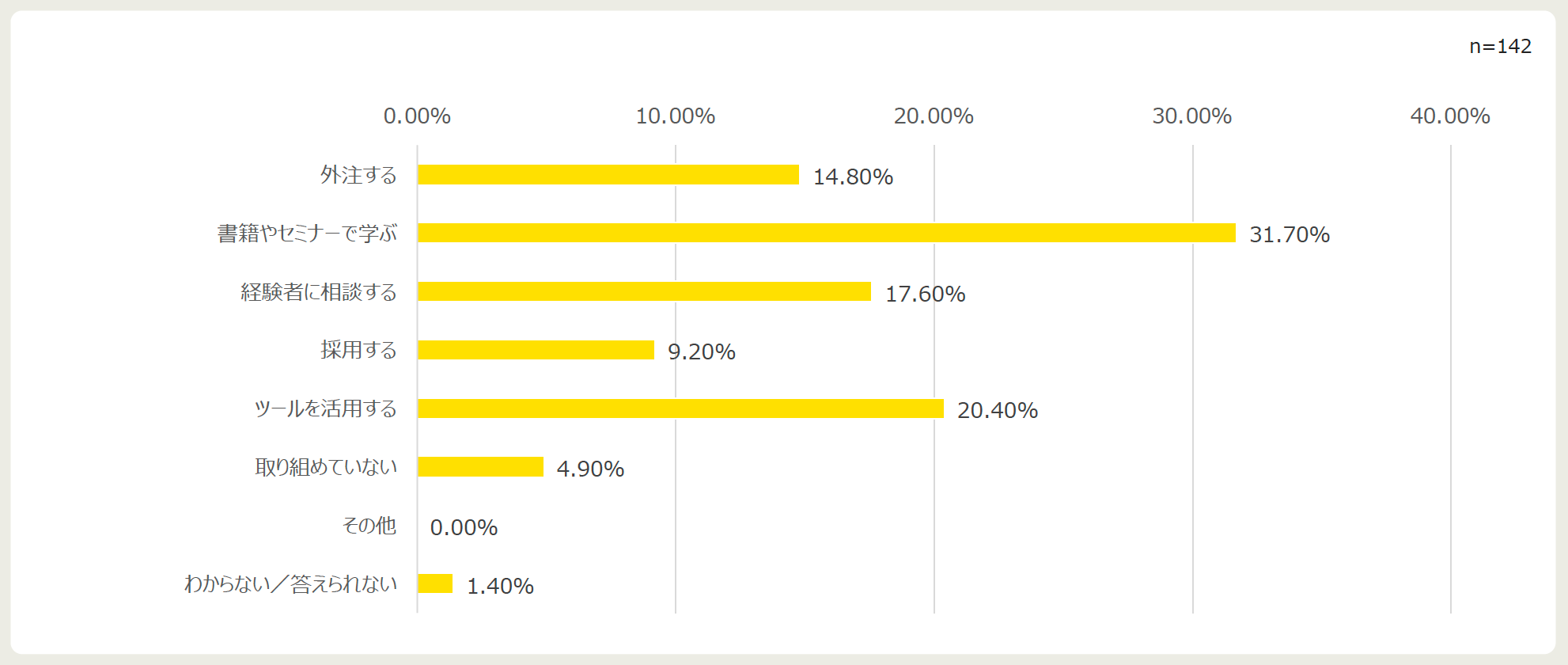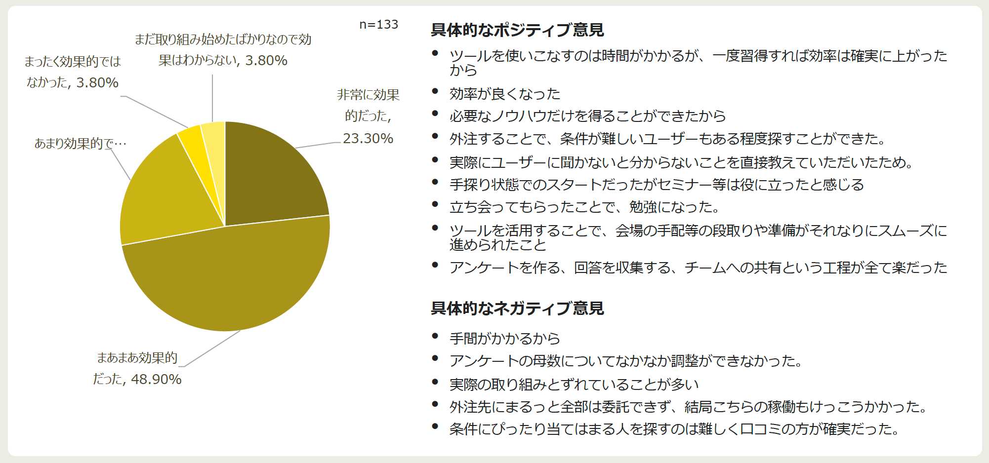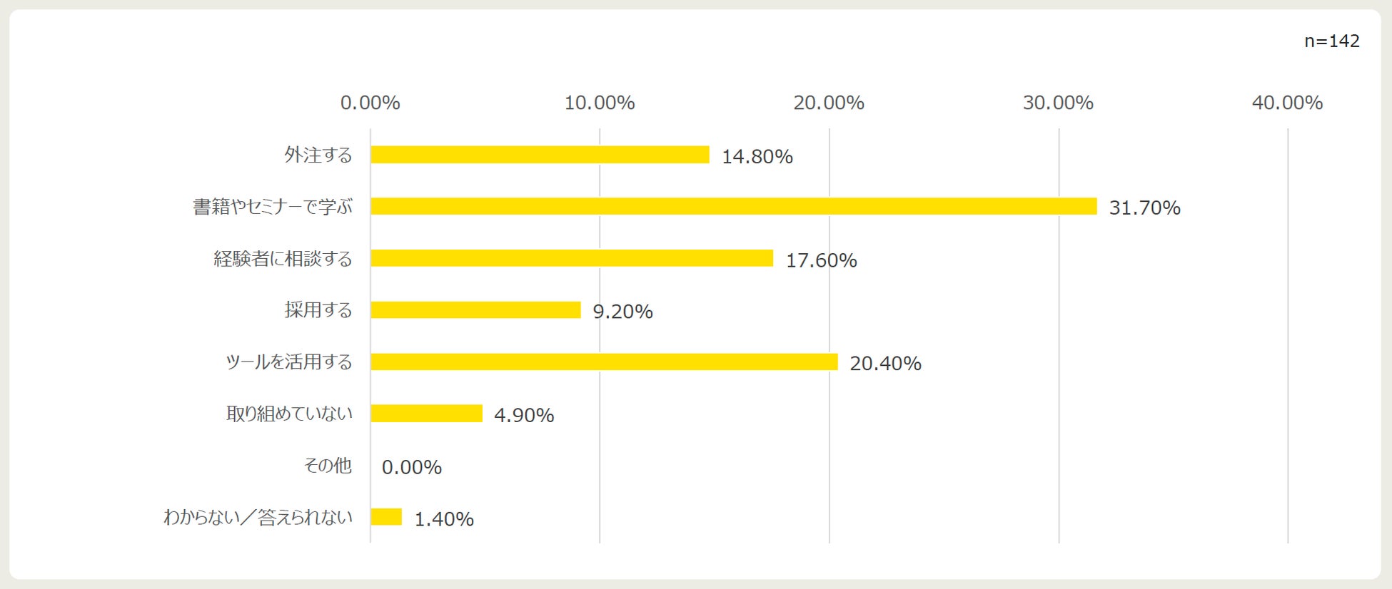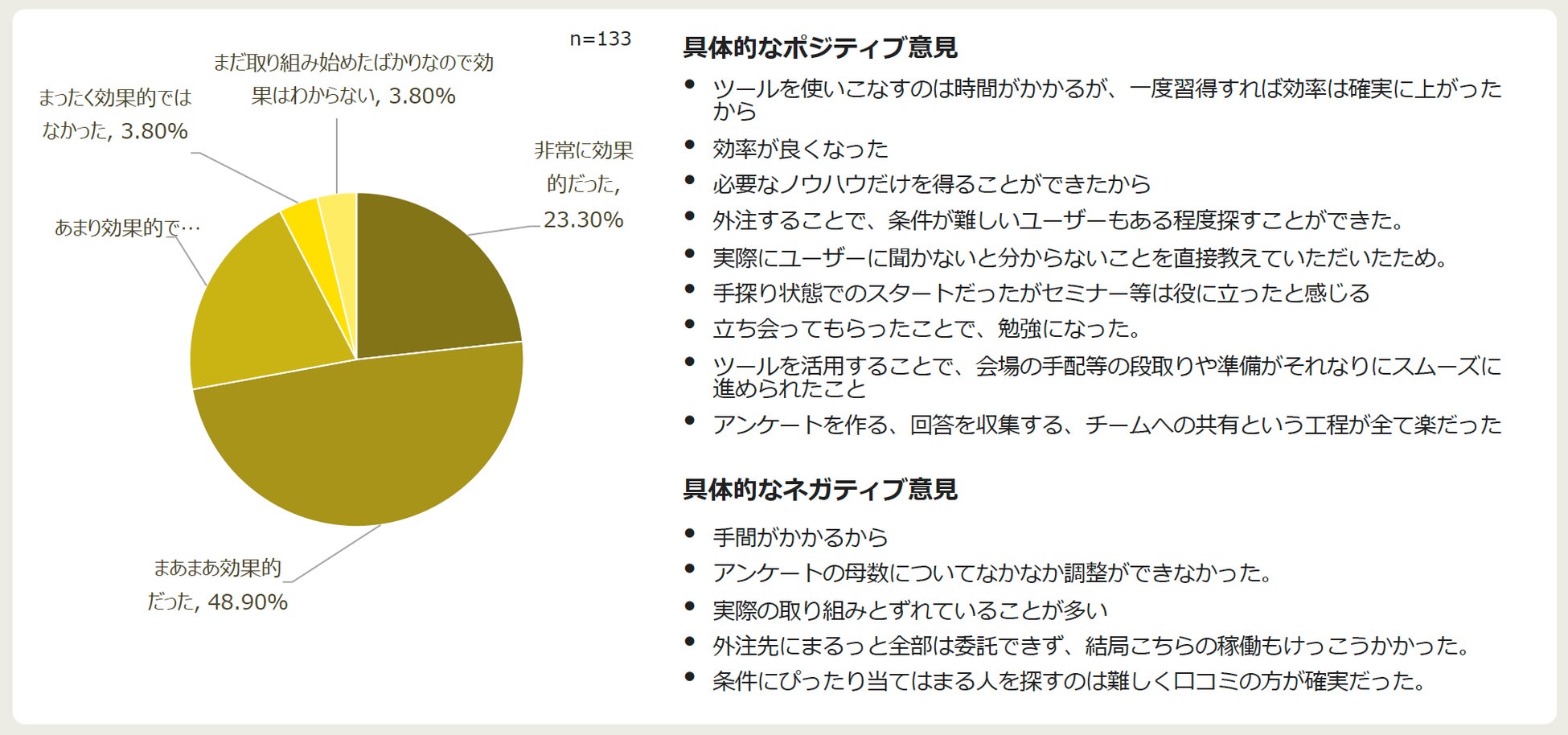 対策としては、『書籍やセミナーで学ぶ』を筆頭に、『ツールを活用する』『経験者に相談する』と続きます。『外注する』が14.8%とそこまで高くなかったところを踏まえると、まずは身近なところで解決方法を探していることが伺えます。また、効果としても『効率が良くなった』『必要なノウハウだけを得ることができたから』『立ち会ってもらったことで、勉強になった』など、実感につながっていました。