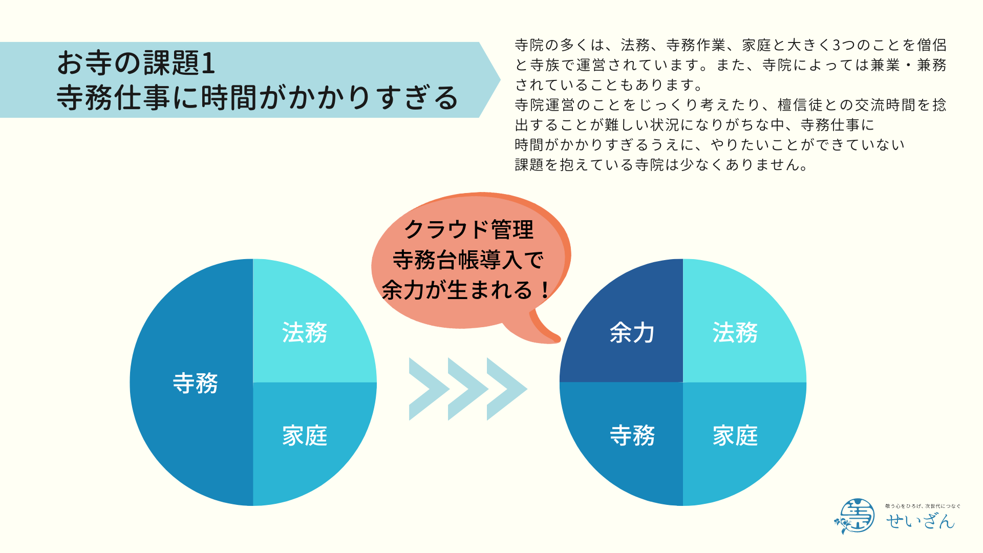 更に寺院は少ない人数で運営しているため法務に加えて電話・来客応対などから情報共有や事務作業の効率化・仕組み化ができず、結果的に檀信徒に迷惑をかけてしまう状況が珍しくありません。