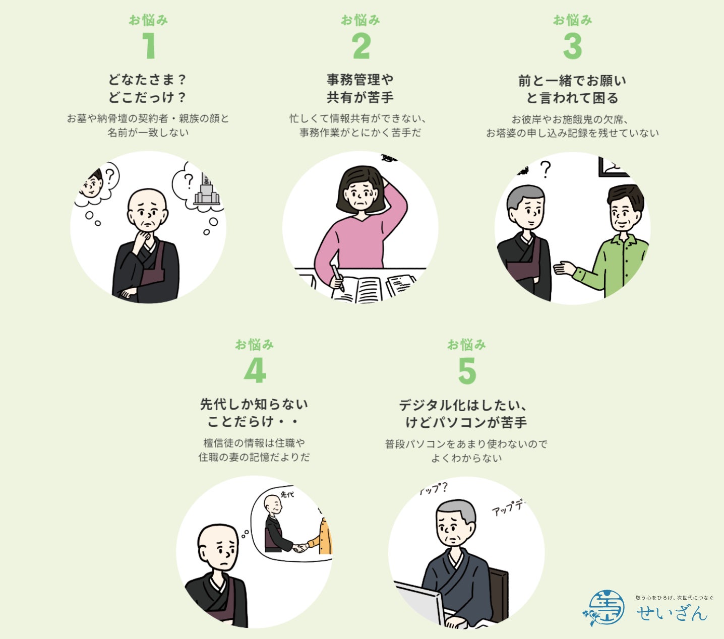 せいざん株式会社は寺院内に事業所を構え、寺院の運営支援を行いながら、12年の歳月の中で1,000件以上の一般の生活者の相談を受け、情報を管理してきました。