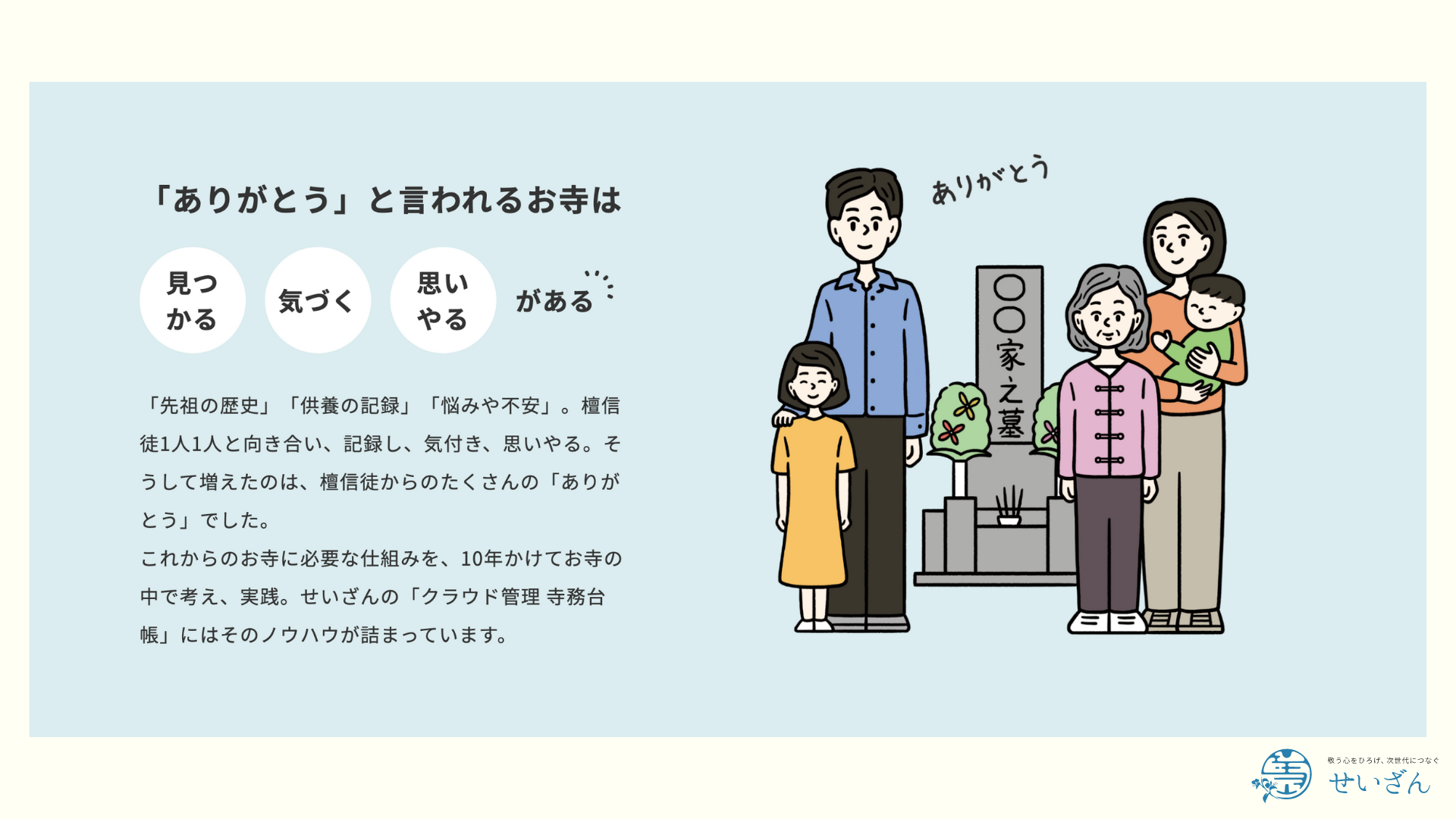 僧侶・寺族が檀信徒・地域と心あるコミュニケーションが交わせることで「ありがとう」と言われる機会創出を支援するシステム「クラウド管理寺務台帳」はせいざん株式会社自社開発のSaaS型顧客管理ツールです。