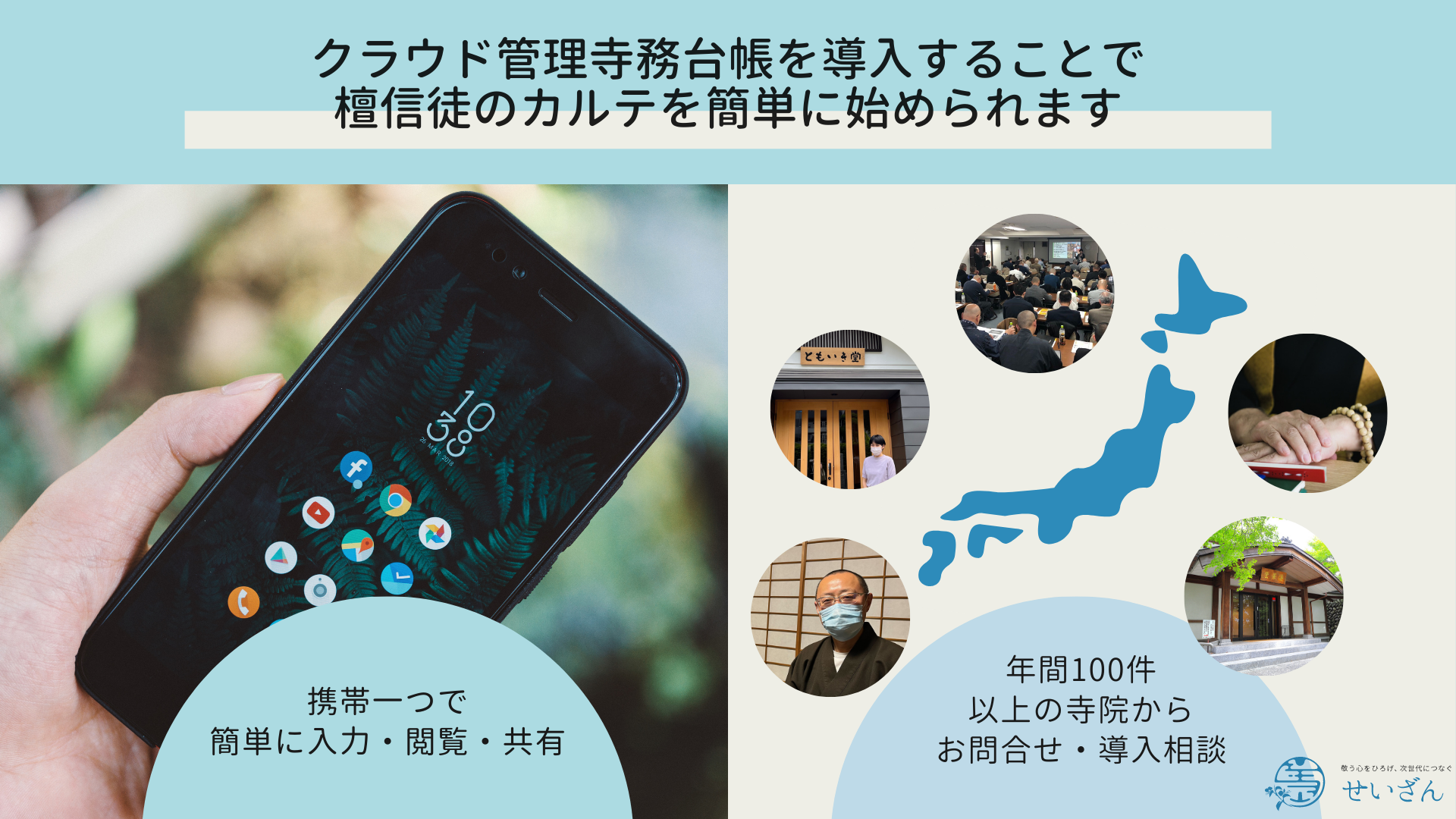 多くの寺院が名簿管理しか行っておらず、肝心の供養の歴史や交流記録が存在しません。これからの寺院に必要な観点の1つとして「檀信徒カルテ」(せいざん株式会社商標登録済)をクラウド管理寺務台帳の開発責任者でもあるせいざん株式会社取締役の池邊が提唱しています。