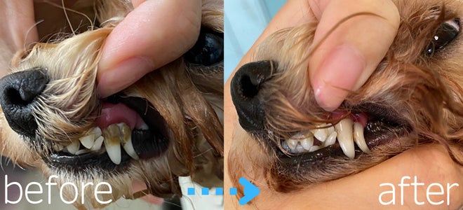 さらにオプションメニューの歯磨き(550円)では、追加料金なしで歯石取りも行っています。ご来店の度にわんちゃんに負担のない範囲で1~4個ずつ取ることができる場合があります。(※嫌がらない犬に限り。歯の状況によっては取れないこともあります。)