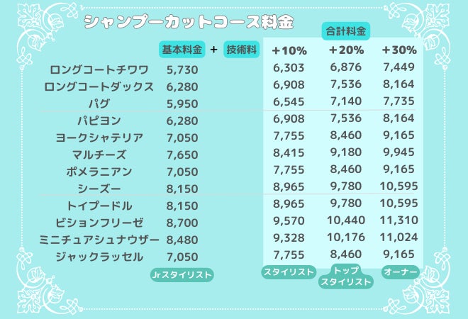 トリミング料金は『基本料金+技術料+オプション料金』の合計金額になります。