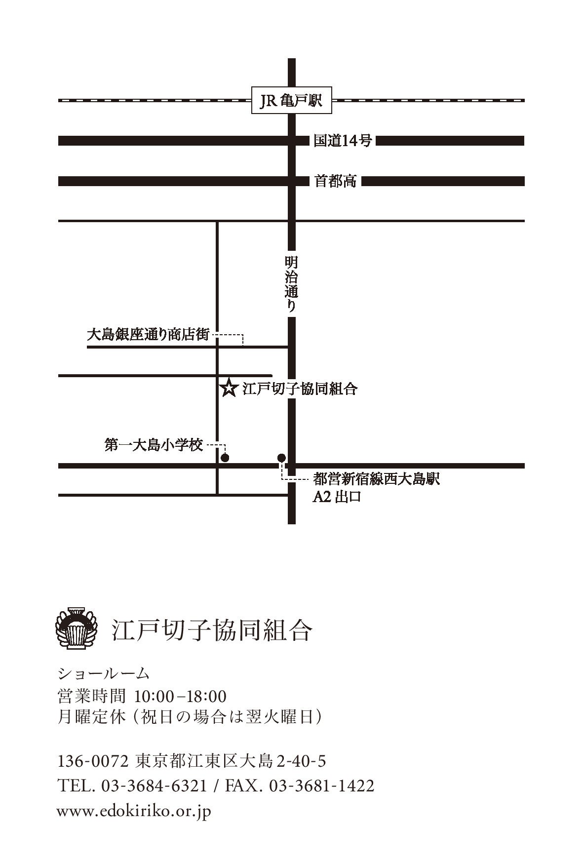 この度開店する「江戸切子ショールーム」は、江東区大島2丁目にあり、都営新宿線西大島駅A2出口から徒歩3分と駅の近傍です。
