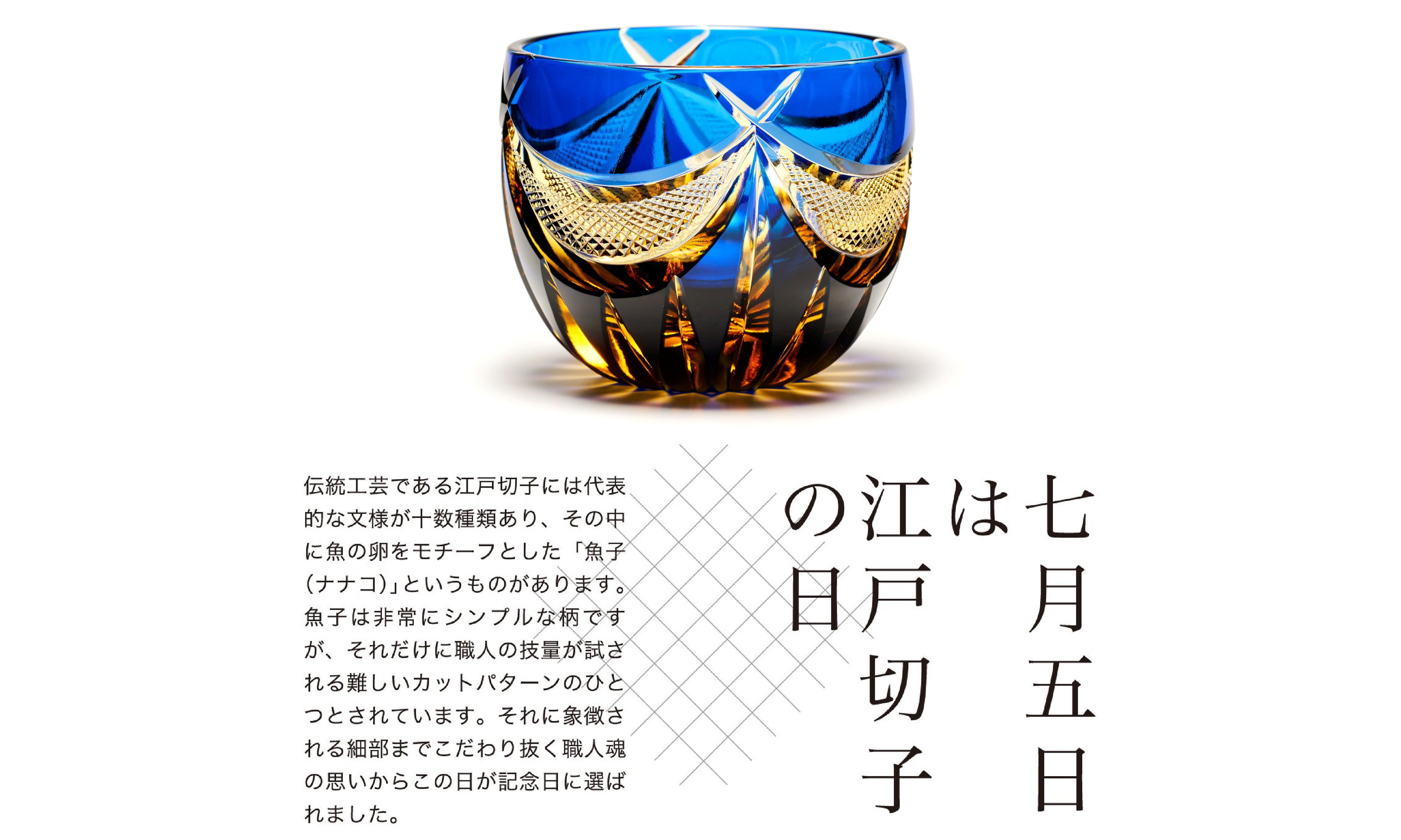 来る「7月5日は、江戸切子の日。」です。2008年に制定し本年15年を数えるこの記念日や、異業種・コンテンツ産業とのコラボ製品制作等の試みを始め、当組合は伝統的工芸品「江戸切子」の振興と発展の為、製造・販売・広報等の協同事業を行う活動をしております。