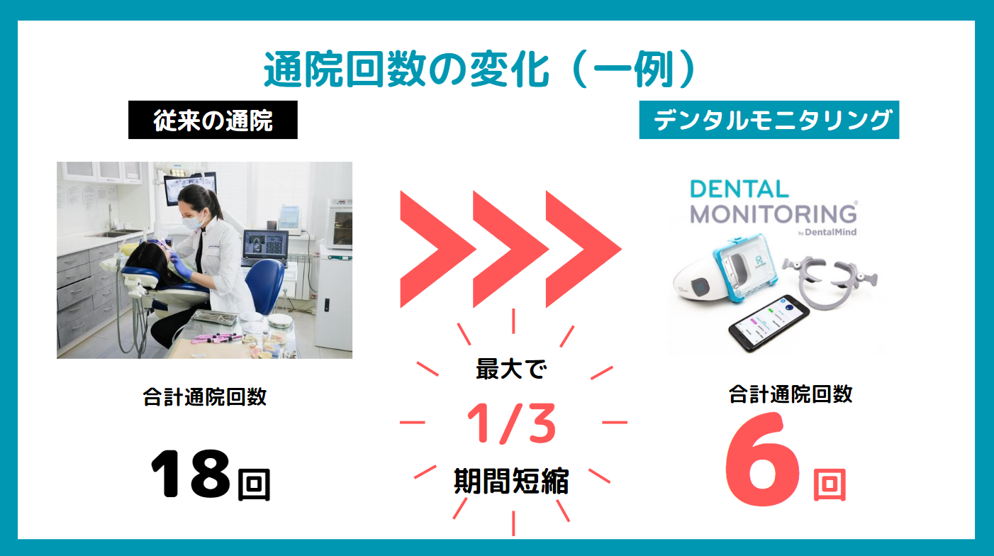歯列矯正の治療回数を最大で1/3も軽減できます、通常の通院回数18回⇒デンタルモニタリングで最大6回に。仕事などがお忙しい方で、極力通院回数を減らしたいという方にはオススメです。