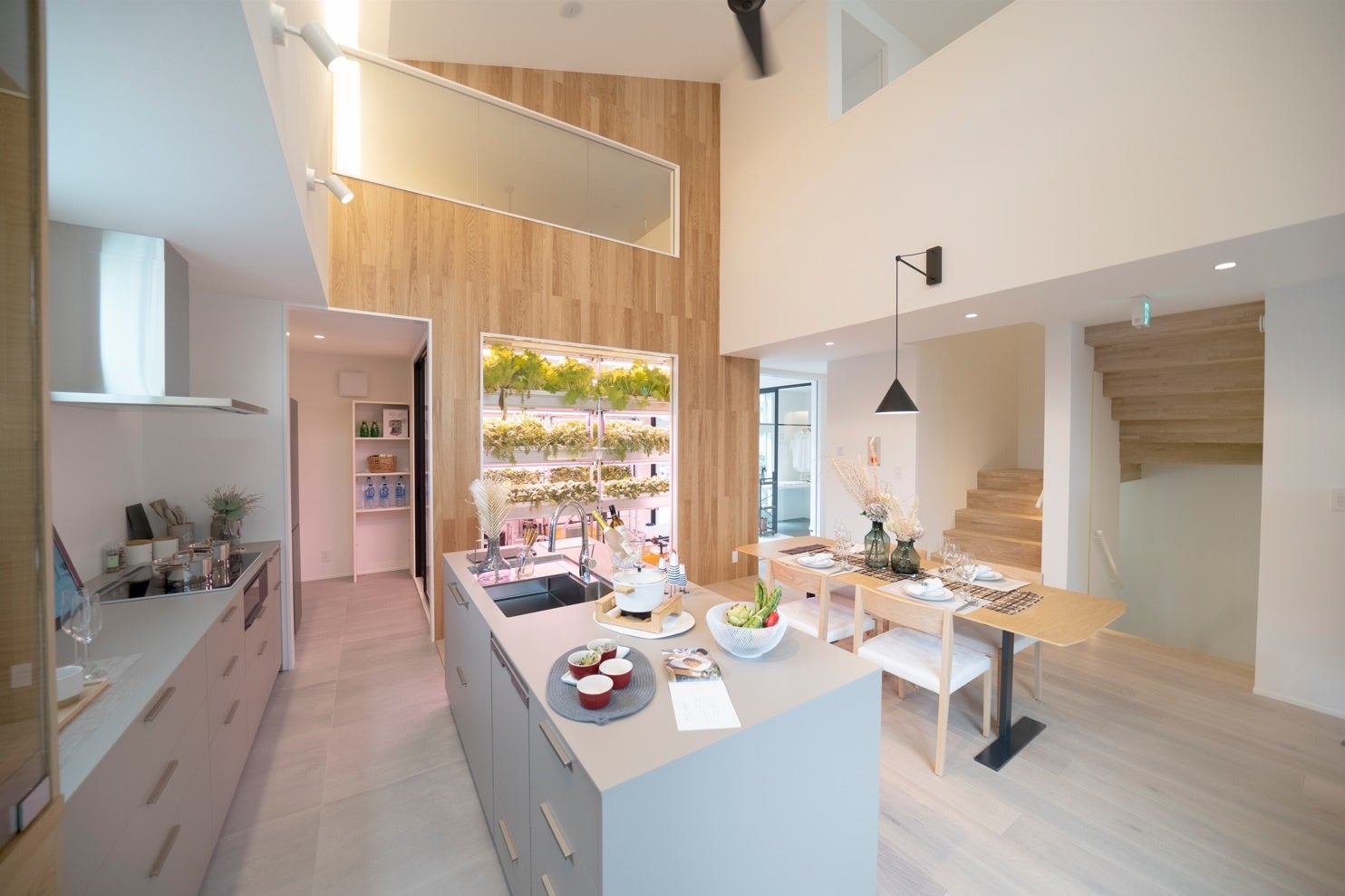 あくまでも住宅で植物工場ではないことから、住空間としての質の高さと栽培機能との両立を行っています。1階は道路からも室内栽培している様子が見えるように計画し、軒先を地域とのコミュニケションスペースとしています。2階DKではピクチャーウィンドウ越しに見える育成室をインテリアに取り込みました。2階バルコニーからは外部階段で3階バルコニーに直接アクセス出来るようになっており、回遊性のあるプランとなっています。各育成室には自動追肥装置を備えた本格的な栽培装置を備え、手間をかけずに収穫出来る室内での栽培は育っていくのを見ているのも楽しく、何よりも実益があり、野菜を介して近隣との新しいコミュニケーションが生まれることも期待できます。