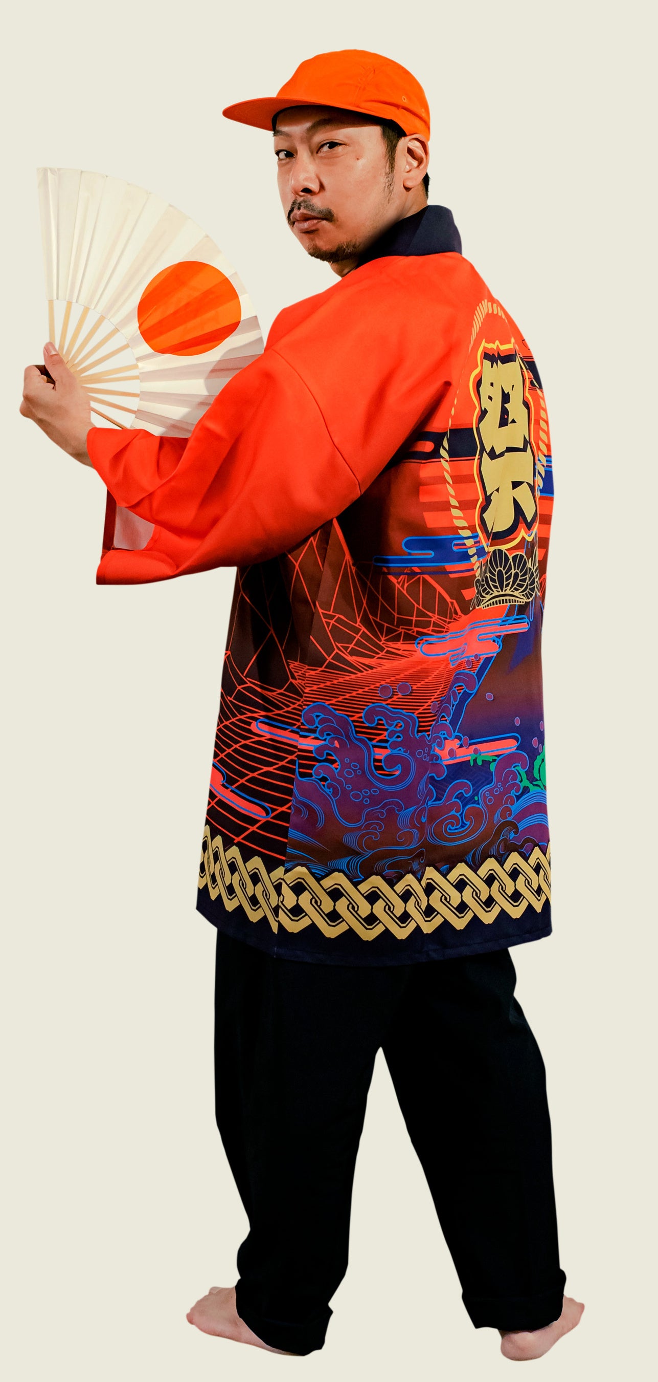 裏ジャケットの撮影には写真家のキツネツキ(kitsunetsuki.jp)氏に依頼し、表面では昔ながらの音頭感を表現、裏面では新しい日本を想像させるサイバーパンクな日本をイメージしています。(デザインはサイバーおかんが担当)