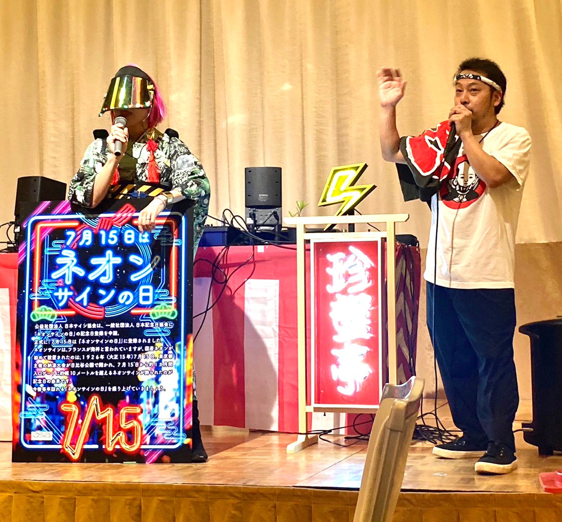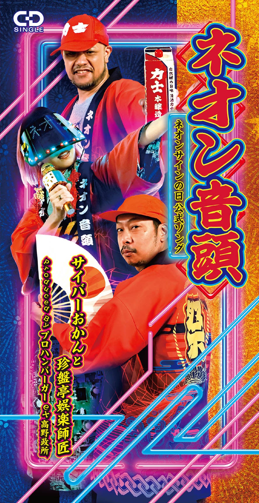 今年初となるネオンサインの日には、ネオンサインを背負って様々な活動をするアーティストのサイバーおかん、DJ盆踊りの立役者として知られるDJの珍盤亭娯楽師匠によるネオンサインの日公式ソング『ネオン音頭』を発表いたします。