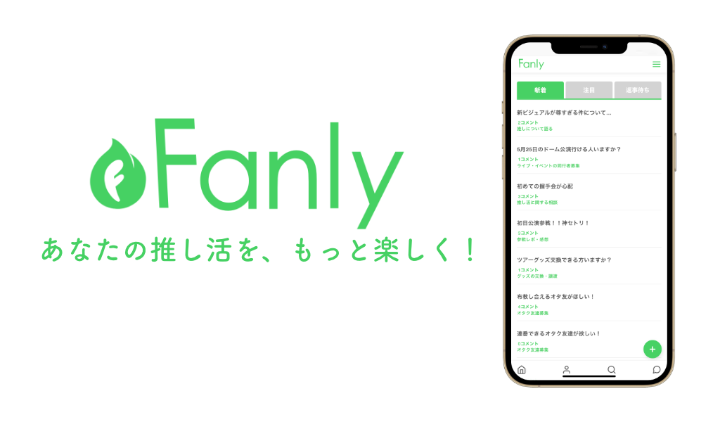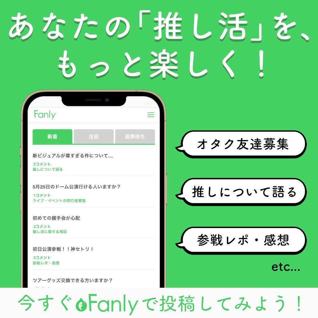 Fanly(ファンリー)は、アイドルやアーティスト、俳優、声優、配信者、芸人、キャラクターなど様々なジャンルのファンが集まり、気軽に掲示板でファン同士の交流ができる推し活に特化されたオンラインコミュニティです。(https://fanly.jp/)