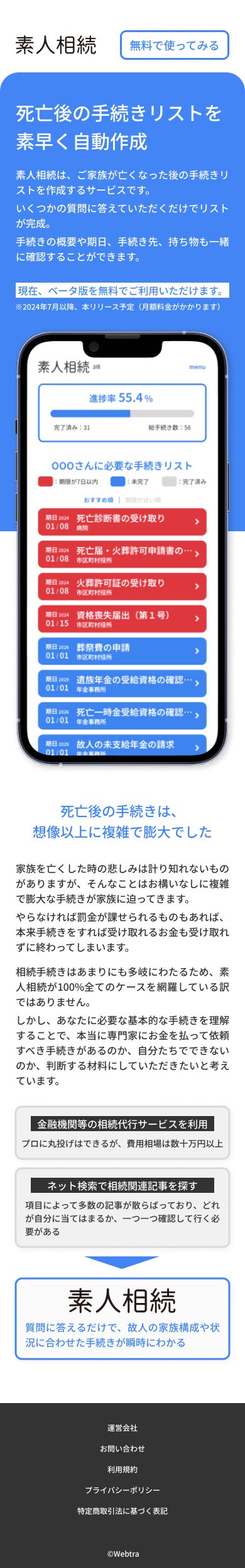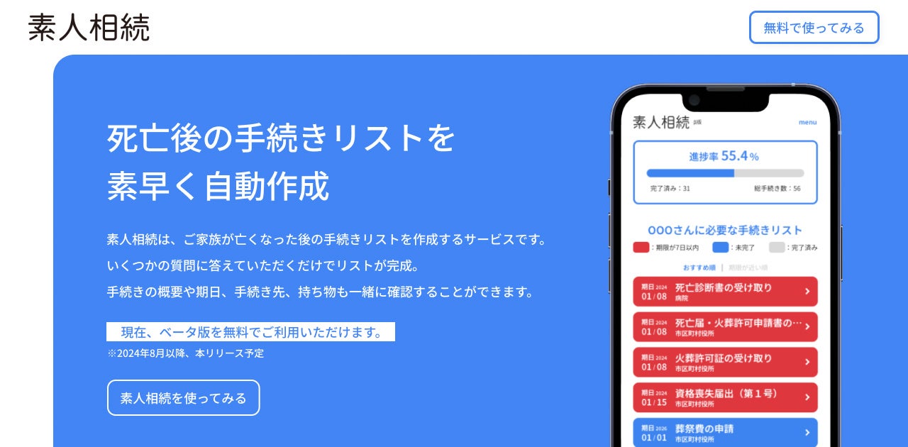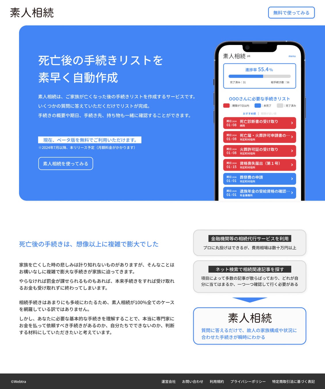 合同会社Webtra(本社:東京都渋谷区/社長:蟹江道弘)は、2024年6月1日から、Webアプリでは初めて(※1)となる、ご親族の逝去後の手続きリストを自動作成できる新サービス「素人相続」のβ版をリリースします。