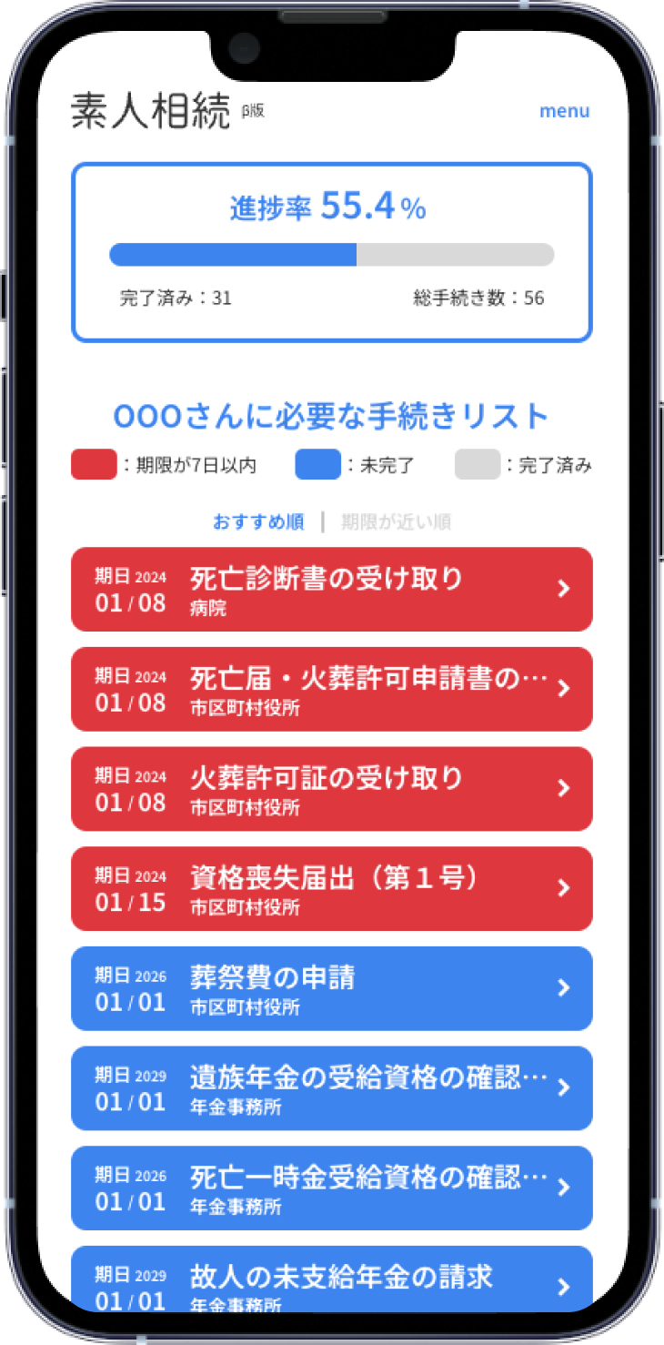 "多死社会"で死亡者数が年々増加する中、遺族に迫る死亡後手続きの負担を軽減するために、シンプルなUIで手軽に使えるWebアプリを開発。数ステップの質問に答えるだけで手続きリストを瞬時に自動作成できる。