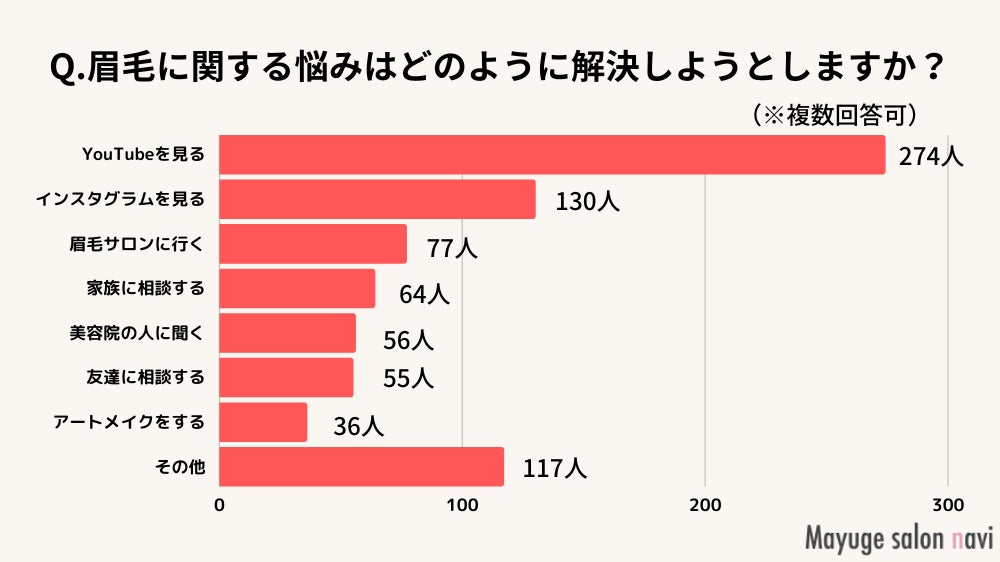 ・眉毛に関する悩みの解決方法は「Youtubeを見る」が1番多い結果になりました。