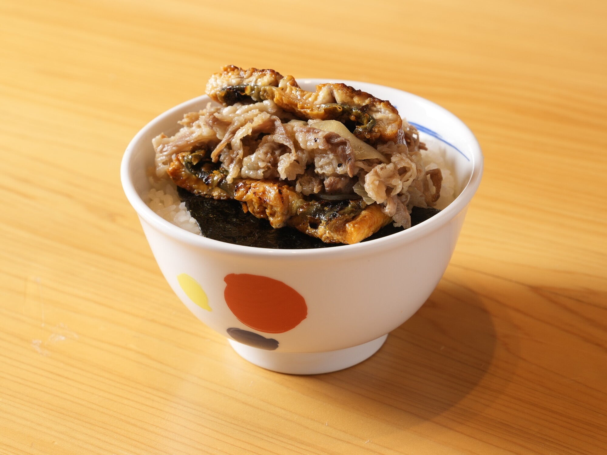 松屋の牛めしと照寿司が監修した「うなぎの蒲焼き」と風味豊かな一番摘み有明海苔がセットになっています。