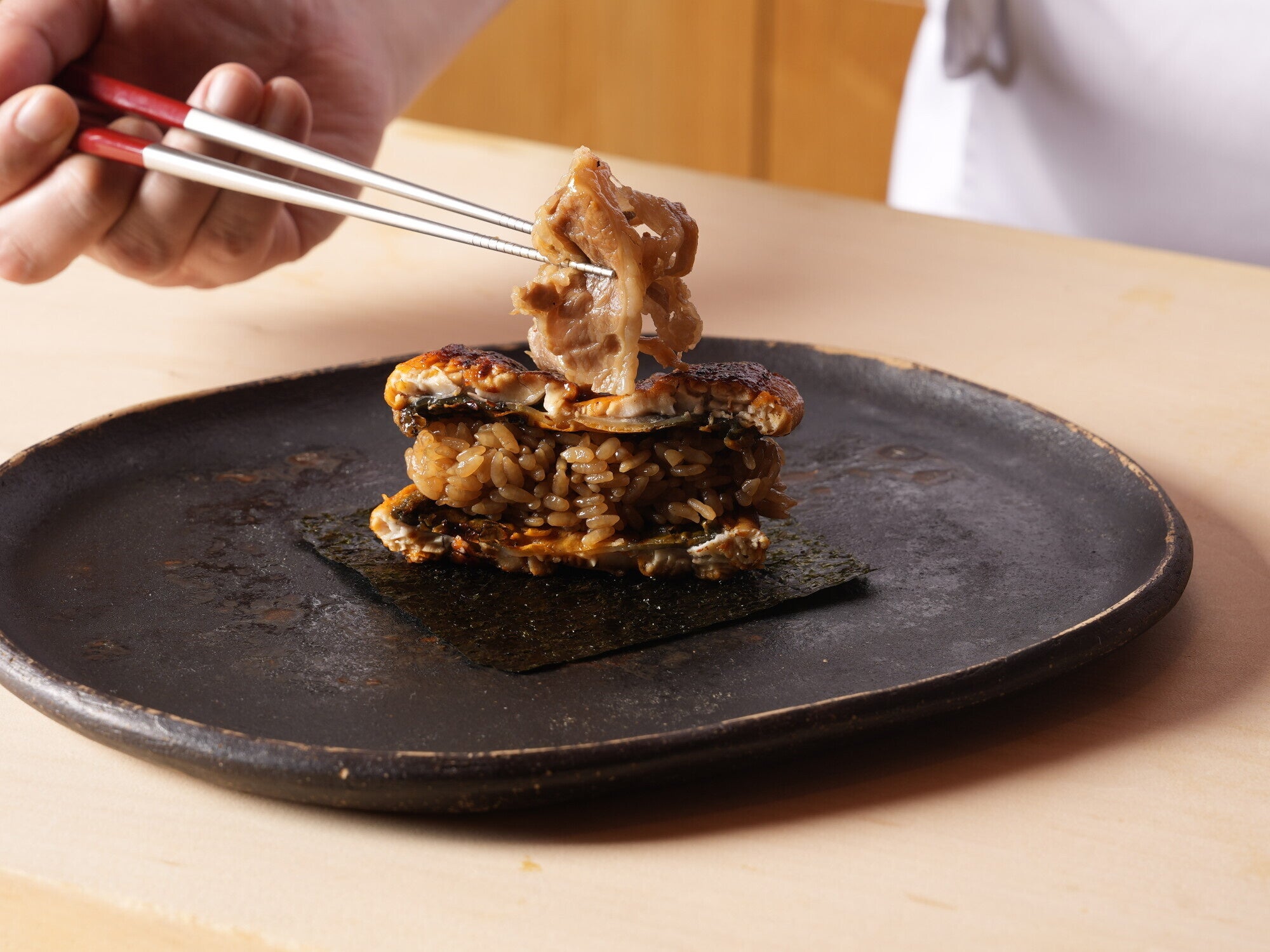 鰻の蒲焼きの香ばしさと、サクッとした歯切れのよい風味豊かな国産特上海苔が口の中に広がります。