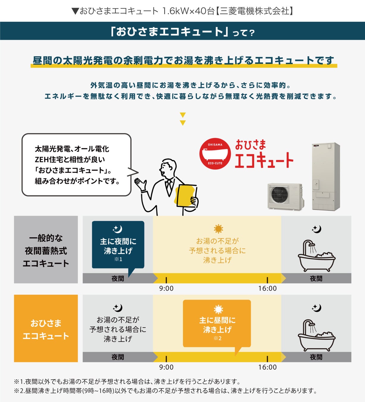 当社では、環境や暮らしに優しいオール電化住宅&ZEH基準の断熱性能を標準仕様(一部エリアを除く)としたオンリーワンな住まいを提案しています。中でも千葉県柏市にある全40棟のZEH分譲住宅「ソラタウン柏の葉キャンパスLiwie」(千葉グランディハウス株式会社 施工・販売)において「おひさまエコキュート」を採用することで従来型のエコキュートよりもCO2排出量や給湯にかかる光熱費を削減。環境と家計に優しいZEH分譲住宅を本格展開しお客様からご好評を頂戴しております。