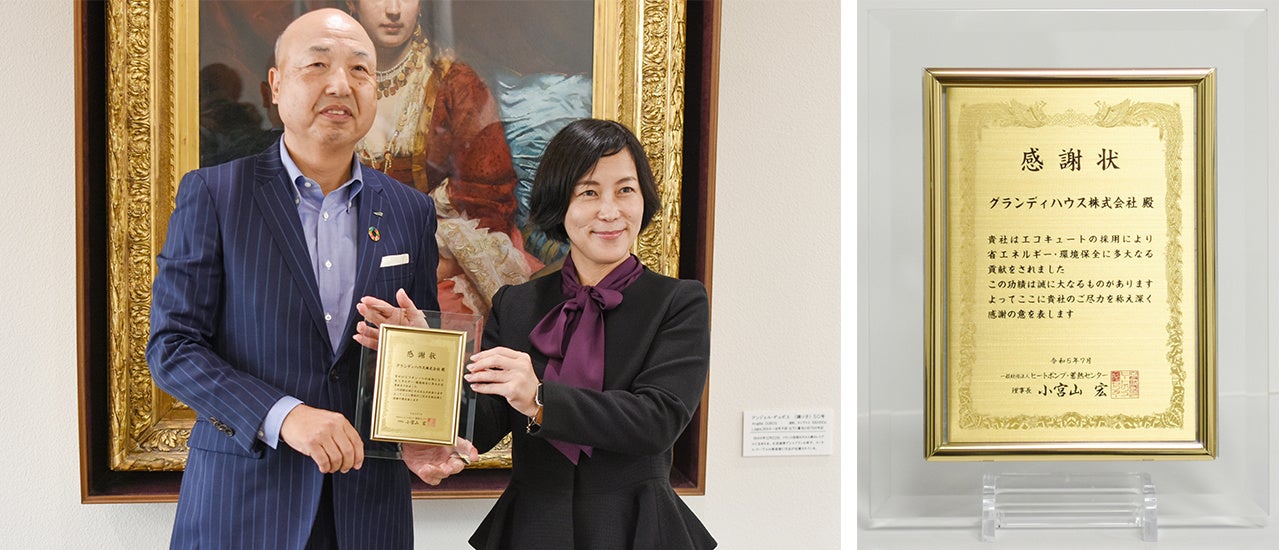 当社は、太陽光発電エネルギーを利用した昼間電力でお湯を沸かす給湯器「おひさまエコキュート」を主力商品である戸建分譲ZEH住宅へ採用。持続可能な脱炭素社会の実現に貢献している企業として、令和5年10月27日に東京電力エナジーパートナー株式会社(代表取締役社長である長﨑様)よりヒートポンプ・蓄熱月間感謝状を贈呈されました。