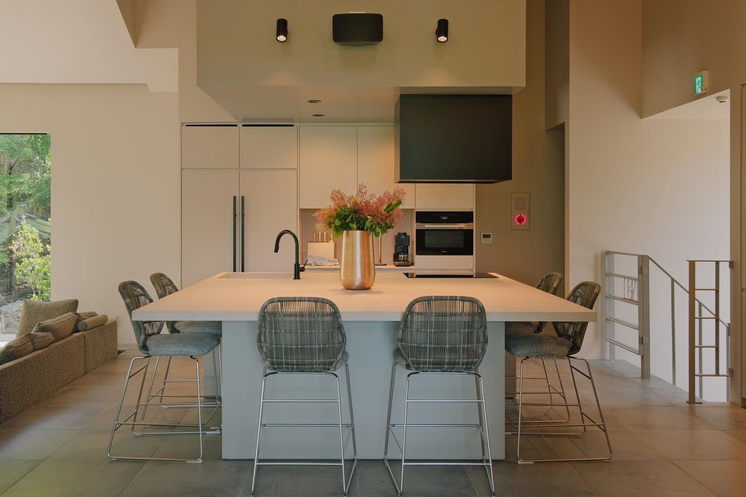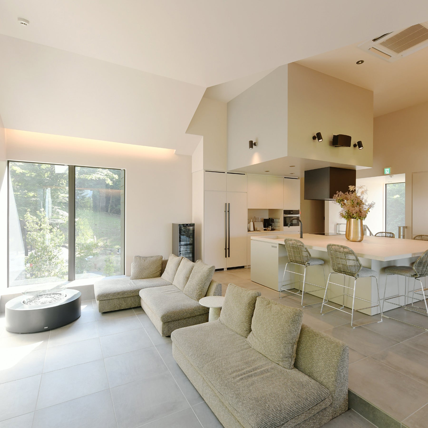 norm.のアイコンでもある大きなアイランドキッチン。料理をする人を孤立させず、お酒を嗜む人やUNOを楽しむ子供たちの、そこに集まる全ての人の視線が交じり合い、全員の気持ちがひとつになる様なダイニングキッチンテーブルを設計しました。ダイニングキッチンテーブルと同じ空間にあるリビングスペースは、ダイニングスペースとはあえて床の高さを変えることで視線のレベルを低く抑え、物理的な間仕切り壁は無くとも意識的に異なる空間にいる様に感じさせます。同時に、三方に配した大きな窓から望む自然の木々に包まれる安心感のある空間を計画しました。
