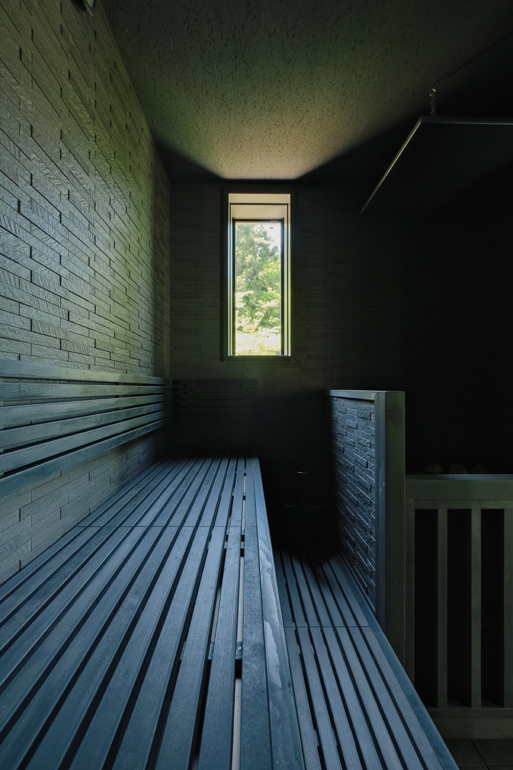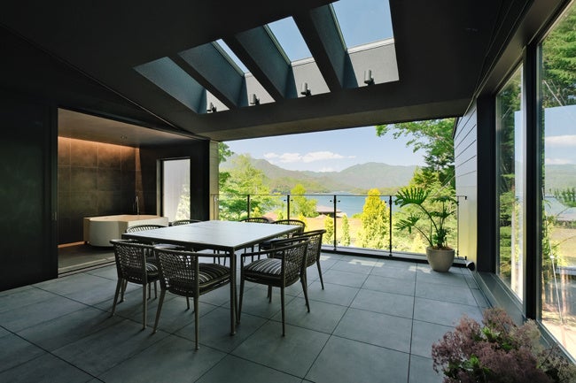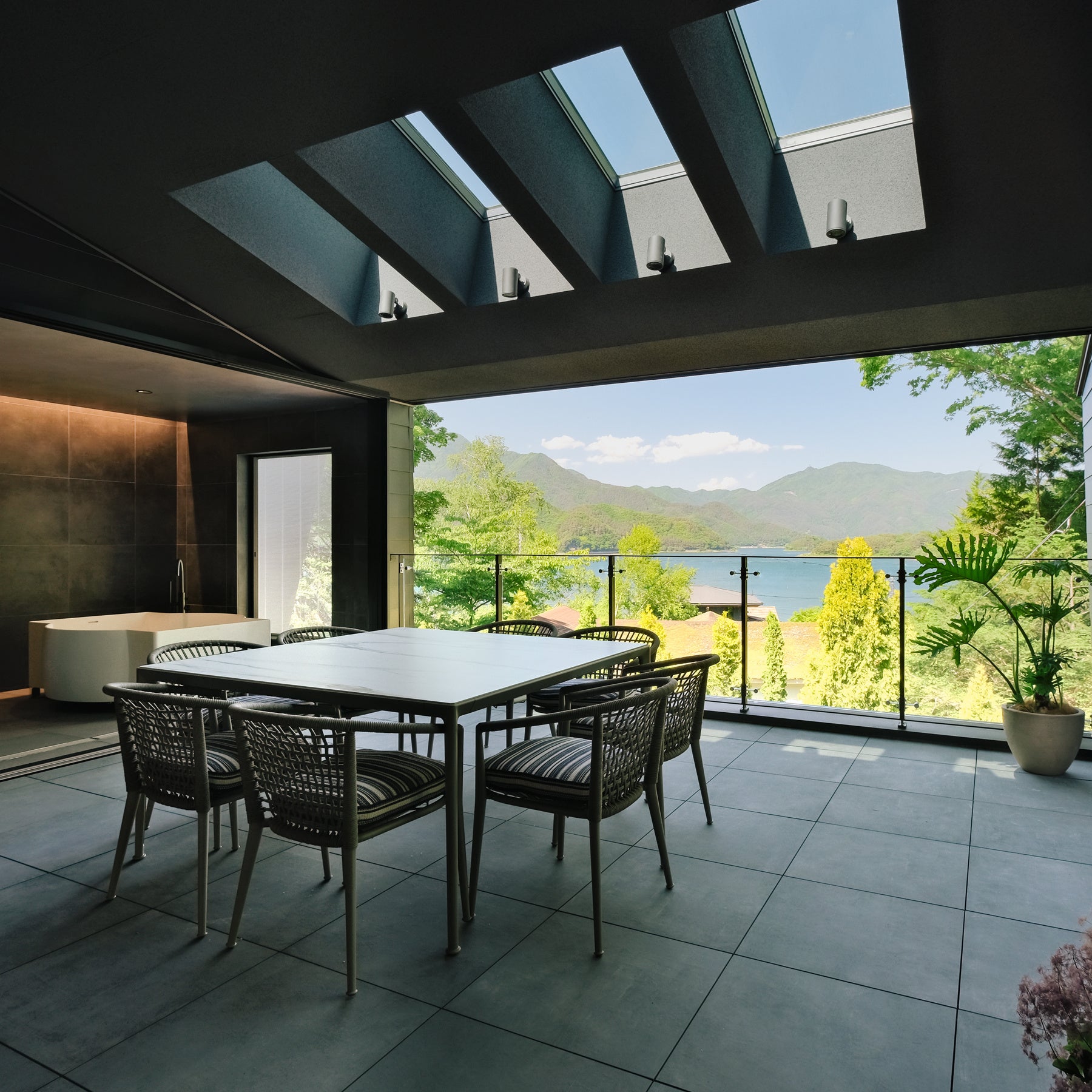河口湖を臨むバルコニーは、屋内としても屋外としても楽しめる、曖昧な空間として設計しました。バルコニーに面した全開放出来る大きなサッシを開ければ、ダイニングスペースからバルコニー、バルコニーからアウトドアバスルームやサウナとも同じ空間に感じられます。
