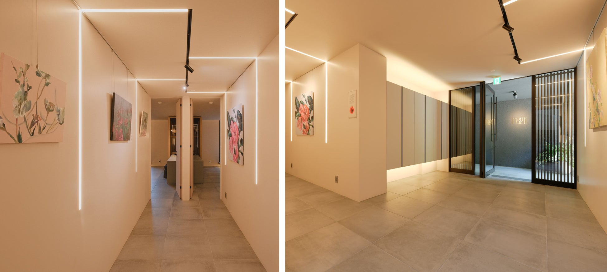 “チル”と“アート”がコンセプトのhotel norm. air fujiでは、入口から客室までを繋ぐエントランスホールで定期的にアート作品を変えることを想定しています。そのため、どの様なアートでも展示出来るように、壁自体がキャンパスとしての機能を持つように計画しました。壁に埋め込まれた照明器具は、アートがあっても邪魔にならず、もしアートが無かった際にも美しく壁面を彩るように計画しました。